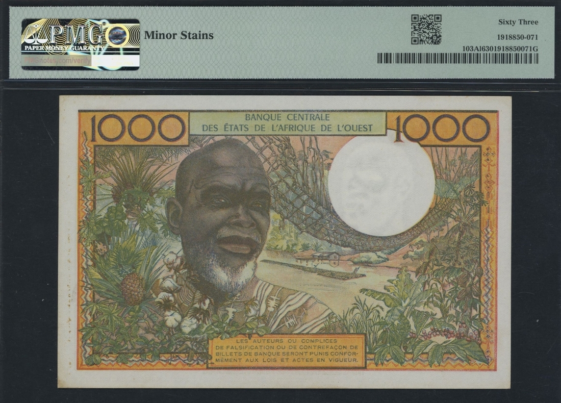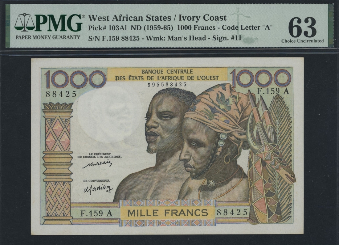(x) Ivory Coast, West African States, 1000 Francs, ND (1959-65), serial number F.159 A 88425, (Pick 103Al), in PMG holder 63 Choice Uncirculated, minor stains