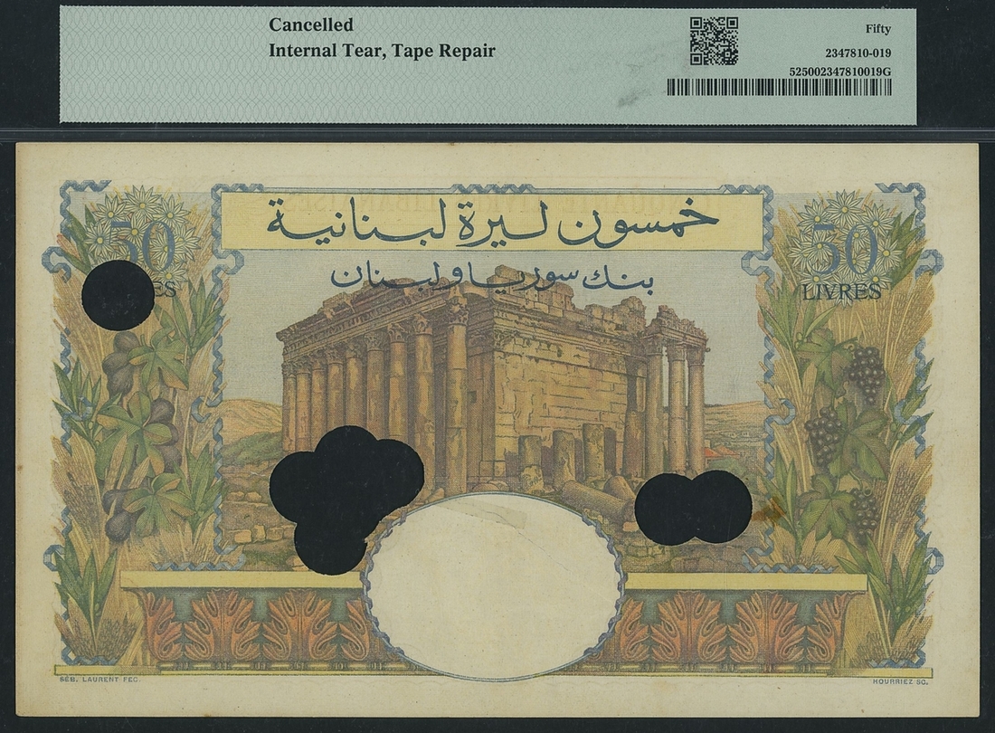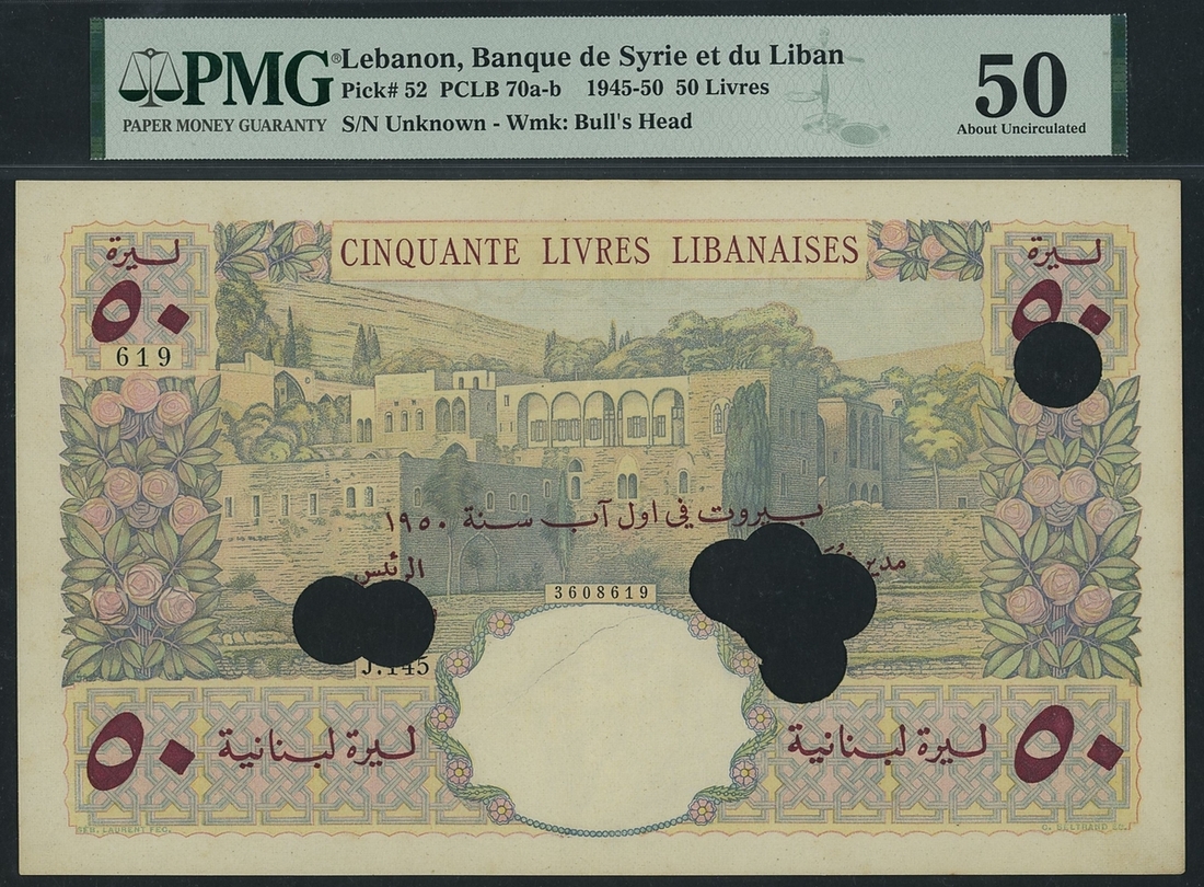(x) Lebanon, Banque de Syrie et du Liban, 50 Livres, 1950, serial number J.145 619, consecutive with the next lot, (Pick 52, BNB B222b), in PMG holder 50 About Uncirculated, cancelled, internal tear, tape repair