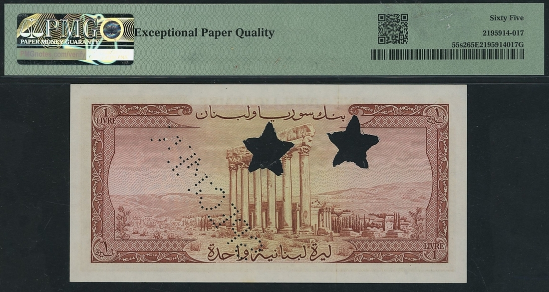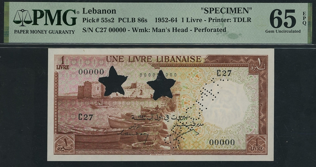 (x) Bank of Syria & Lebanon, specimen 1 Livre, 1952-64, serial number C27 00000, (Pick 55s2, BNB 224as1) in PMG holder 65 EPQ Gem Uncirculated