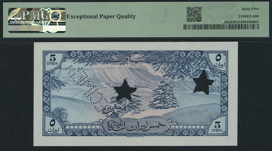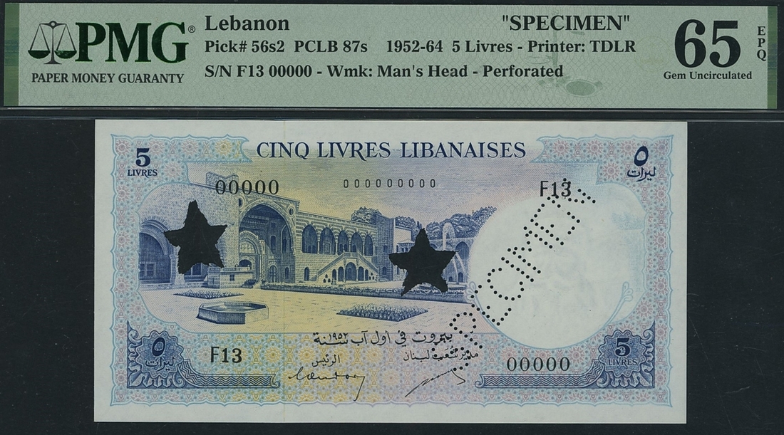 (x) Bank of Syria & Lebanon, specimen 5 Livres, 1952-64, serial number F13 00000, (Pick 56s2, BNB 225as) in PMG holder 65 EPQ Gem Uncirculated