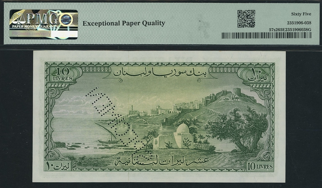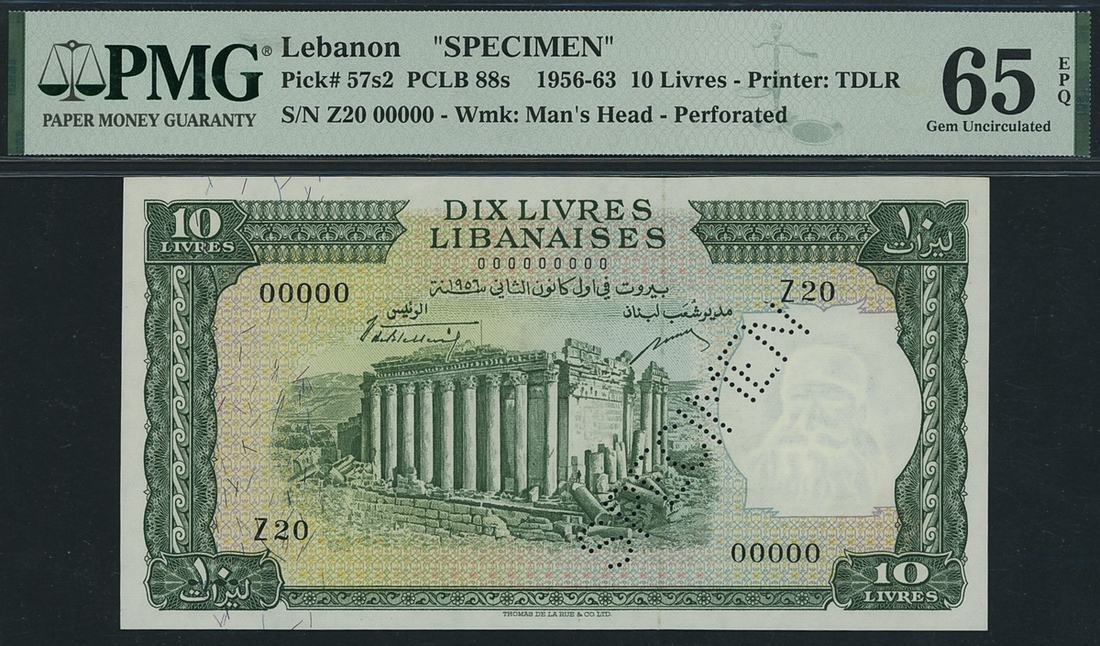 (x) Bank of Syria & Lebanon, specimen 10 Livres, 1956-63, serial number Z20 00000, (Pick 57s2, BNB 226as) in PMG holder 65 EPQ Gem Uncirculated