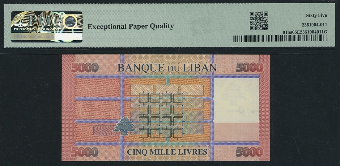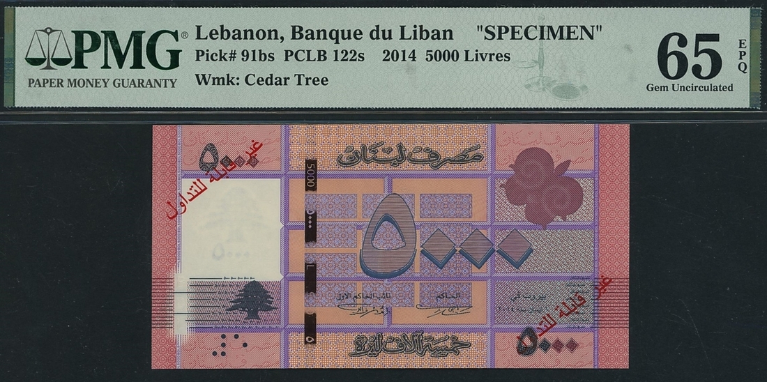 (x) Bank of Lebanon, specimen 5,000 Livres, 2014, no serial number, (Pick 91bs, BNB 533bs) in PMG holder 65 EPQ Gem Uncirculated