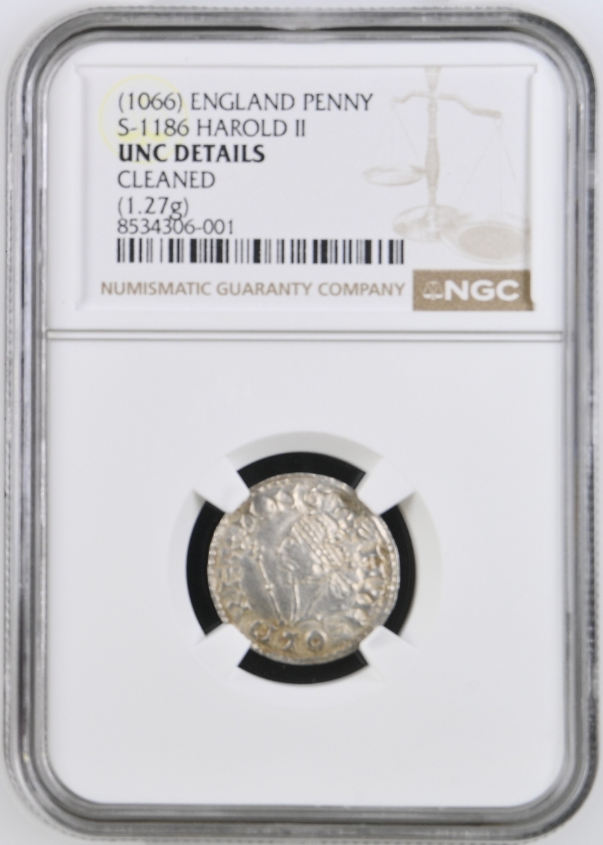 Harold II Godwinesson (5 January - 14 October 1066), 'PAX' Type with Sceptre, Penny, 1066, London, Swetman, + HAROLD REX ANGL, crowned head left, beard of two rows of small pellets, in front a sceptre tipped with a quatrefoil of pellets and a further pellet at bottom and middle of sceptre shaft, rev. + SVETMAN ON LVN, commencing at 3 o'clock, across field and between two pelleted lines, PAX, within beaded inner circle, 1.27g [19.60grns], 6h (SCBI 2 [Hunterian], 1200; SCBI 9 [Ashmolean, Part I], 1100; SCBI 18 [Copenhagen, Part IV], 1296; SCBI 48 [Northern], 1083; EMC 2013.0231, 2015.0128; North 836; BMC I; S.1186).