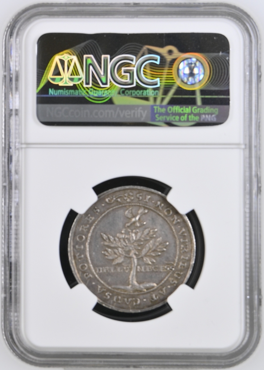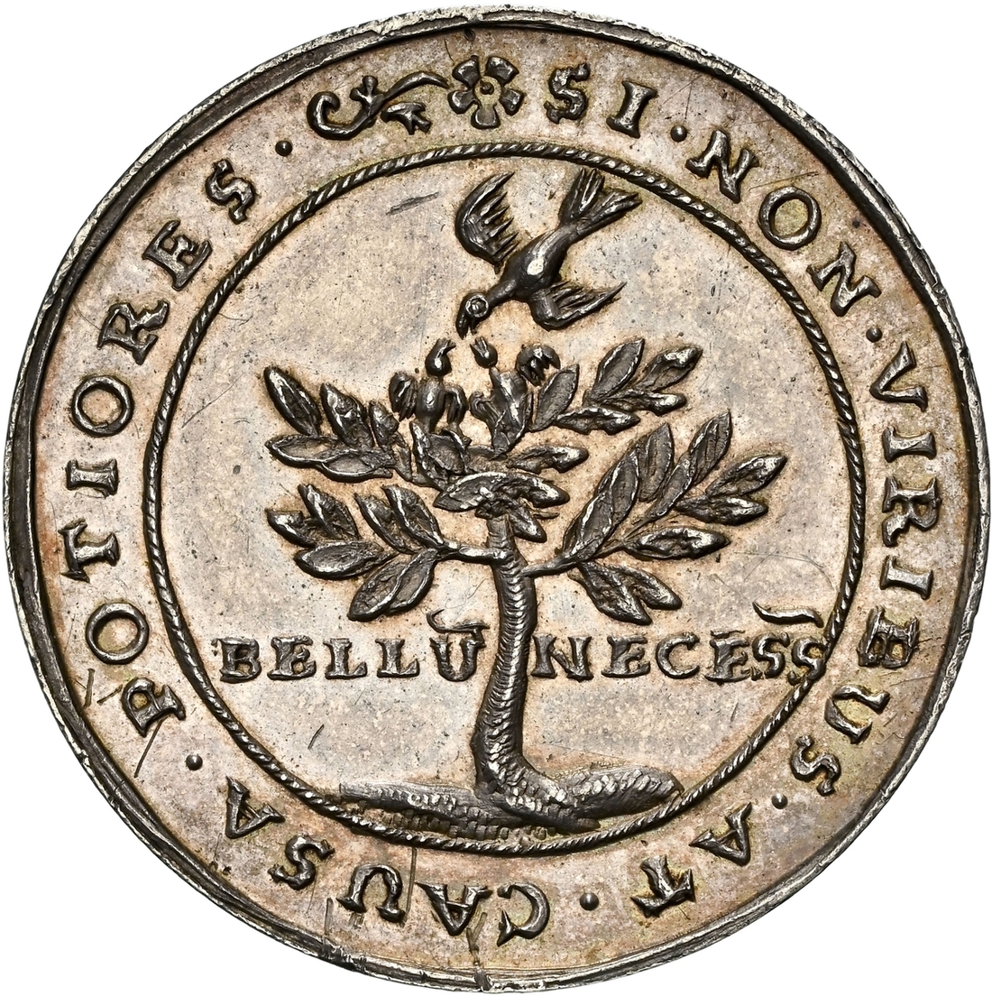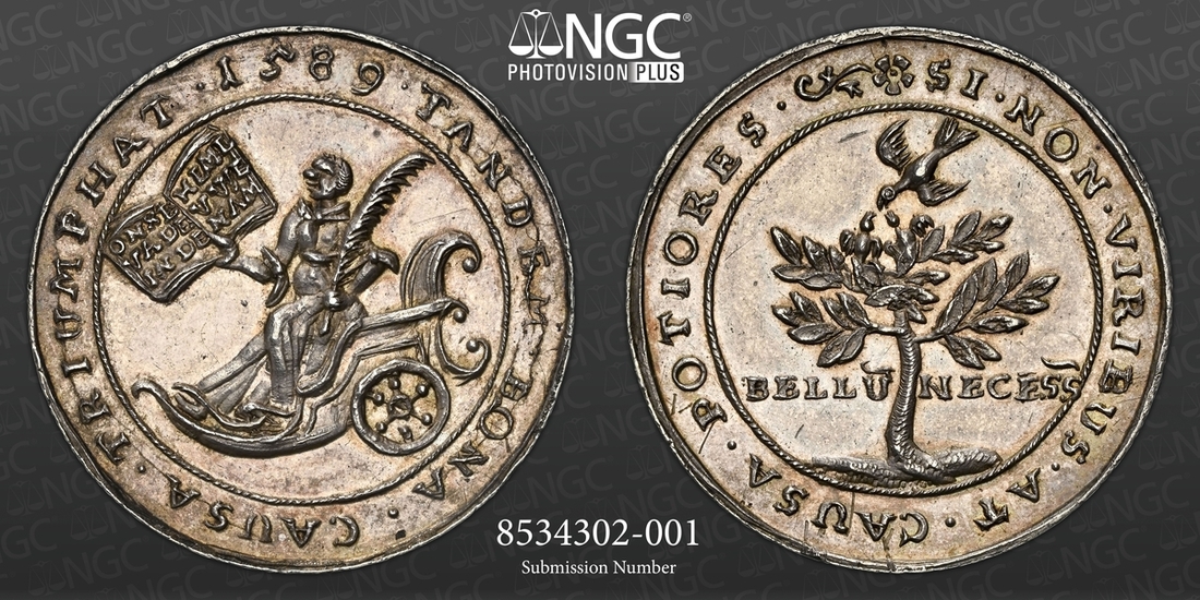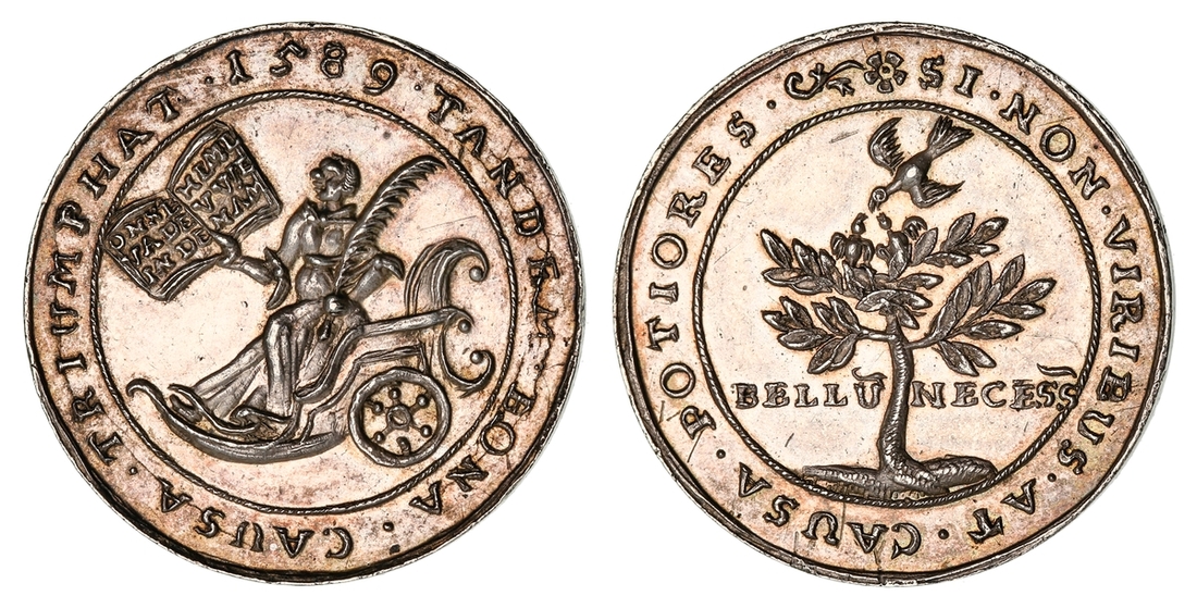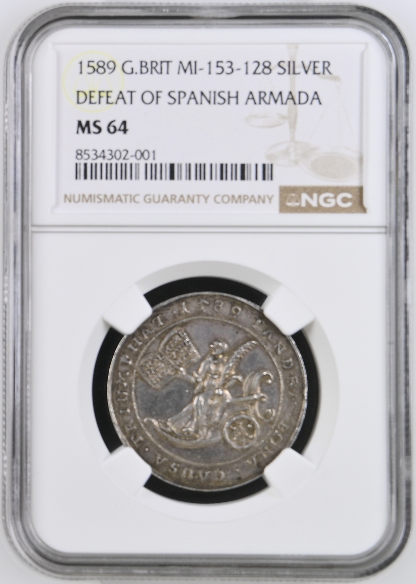 NGC MS64 | National Thanksgiving upon the Defeat of the Spanish Armada, AR Medalet or Token, 20 August 1588 [struck 1589], unsigned. . TANDEM . BONA . CAVSA TRIVMPHAT . 1589., Queen Elizabeth seated in a car holds a palm branch and a prayer book inscribed with the beginning of the Lord's Prayer in Dutch ONSE VADER IN DEN HEMEL UWEN NAEM WERD GEHEY .,rev. . SI NON . VIRIBVS . AT . CAVSA POTIORES ., in a tree a nest of young birds defend themselves against a bird of prey; across the tree, BELLV NECESS, edge plain, 10.51g, 29.5mm. (van Loon I, 388, 2; MI i 153/128; V. B. Crowther-Beynon [BNS, 1931], p. 136; Eimer 63; Rodriguez-Salgado 16.17; Saunders/Vanhoudt 1588-18).