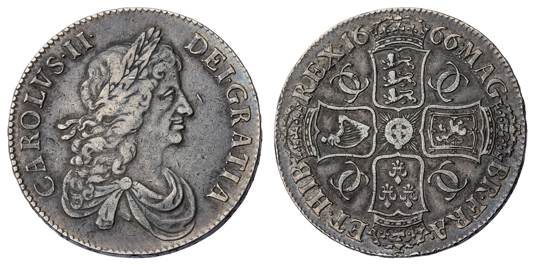 Charles II (1660-1685), Crown, 1666 XVIII, second laureate and draped bust right, rev. four crowned shields cruciform, six strings to harp, edge lettered upwards, 29.87g, 6h (ESC 32; Bull 366 [S]; S.3355).