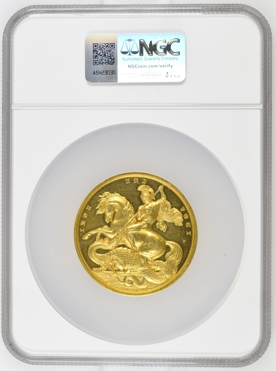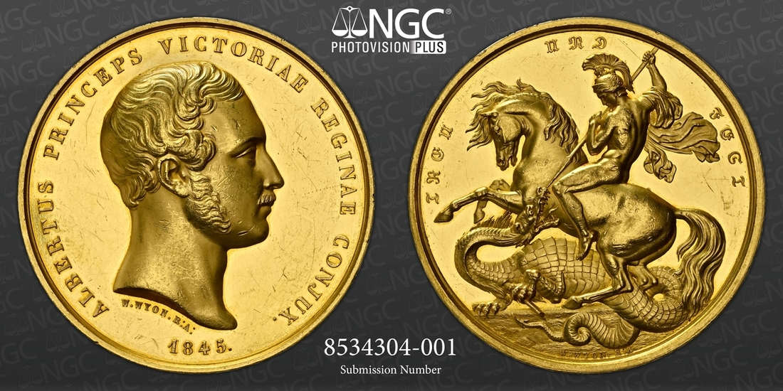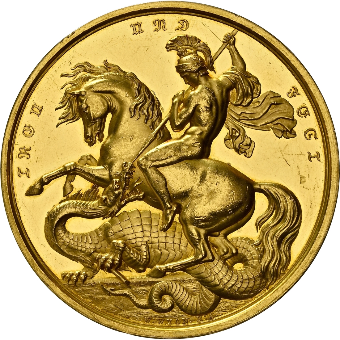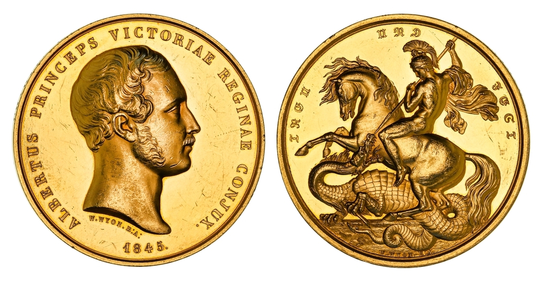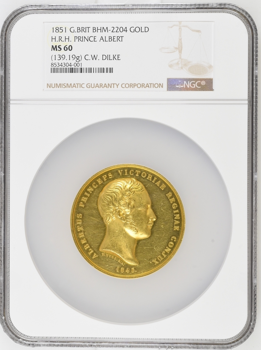 NGC MS60 | Prince Consort's Medal, 1845 [struck October 1851], in GOLD, His Royal Highness' Personal Award to Royal Commissioners for the Great Exhibition of 1851, engraved by William Wyon for the Royal Mint, ALBERTUS PRINCEPS VICTORIAE REGINAE CONJUX. 1845. bare head right, rev. TREU UND FEST, in gothic script, St. George and Dragon poised in mortal combat left, edge plain but for presentation engraving: CHARLES WENTWORTH DILKE ESQ. 1851, 56.1mm, 139.17g, 12h (RCIN 2082378 [Glass Plate Negative]; RCIN 443372 [Silver, Lunettes]; Eimer 1398; BHM 2204).