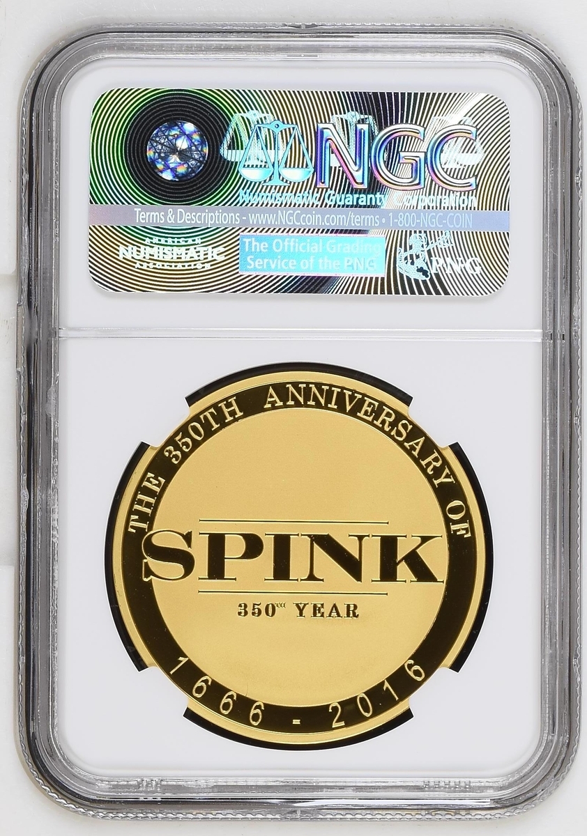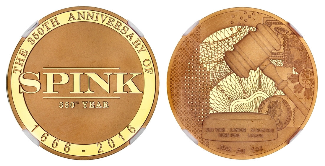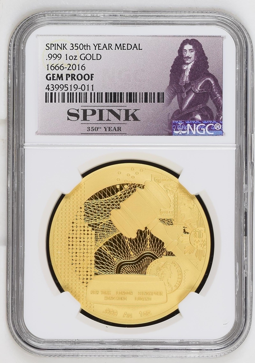 NGC GEM PROOF | Gold 1oz Medal, 2016, THE 350TH ANNIVERSARY OF SPINK 1666-2016, SPINK in centre surrounded by legend, rev. NEW YORK LONDON SINGAPORE | HONG KONG LUGANO | .999 AU 1OZ, Auctioneer's gavel at centre, surrounded by Coins, Medals and Stamps, edge plain, .999 Fine Gold, 31.101g*, 12h.
