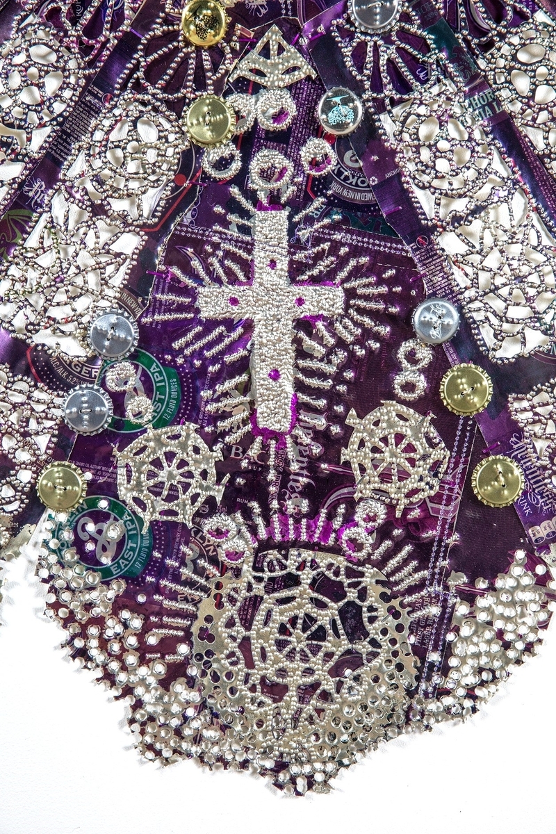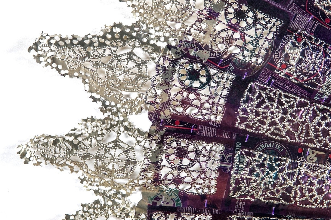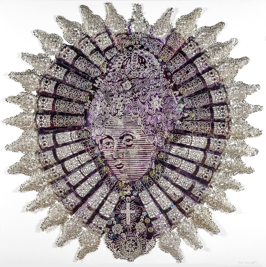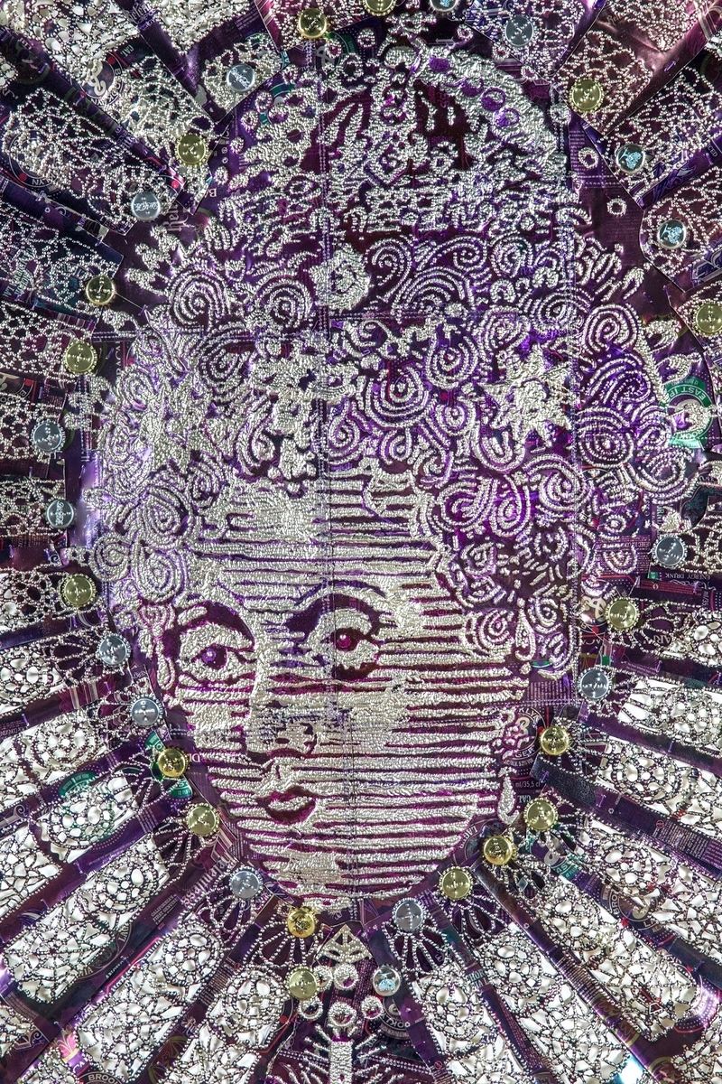 "Elizabeth Queen of Savage Gardens", Framed original artwork made from laser cut beer cans, by Anne Carrington, an eye-catching portrait of Queen Elizabeth I surrounded by an intricate lace ruff.