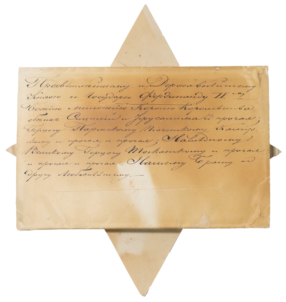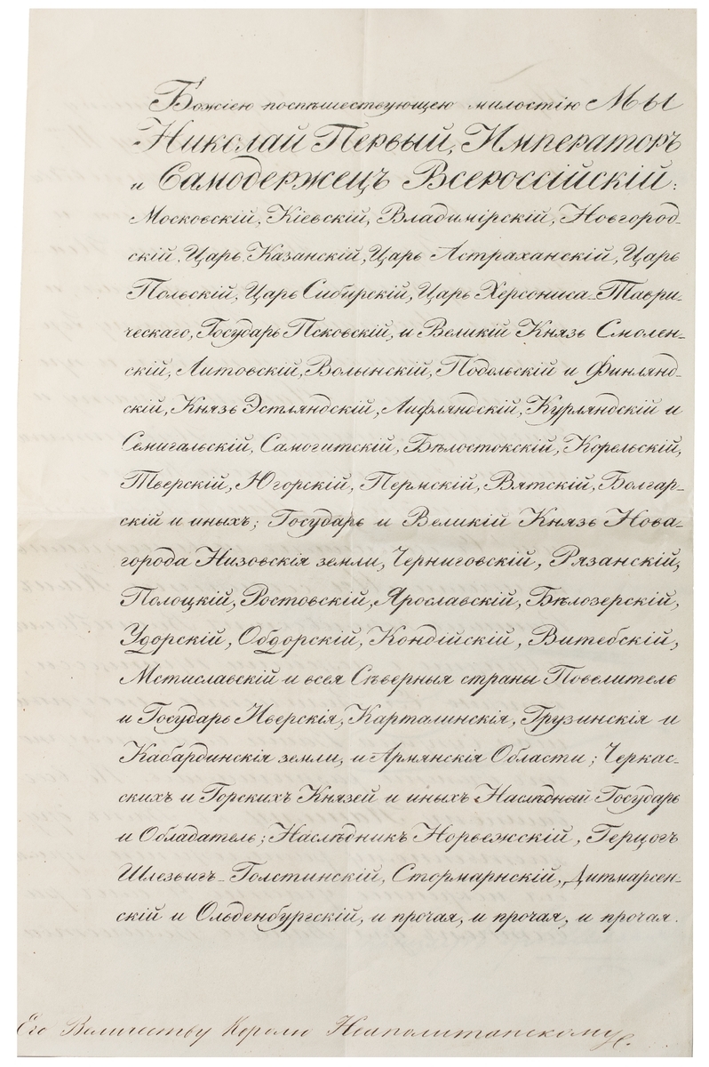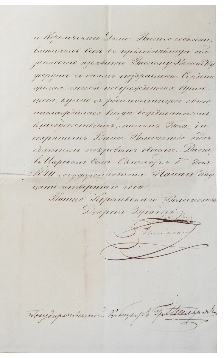 iii) Nicholas I, who reigned over Russia between 1825-1855. 1849 (7 October) letter signed from Sarskeyo Selo to Ferdinand II, King of the Two Sicilies, writing to congratulate him on the birth of a Maria Pia, Princess of the Two Sicilies, titular Duchess consort of Parma and wife of Robert I, Duke of Parma. Together with original cover with intact wafer seal, showing usual signs of disinfection. (3)
