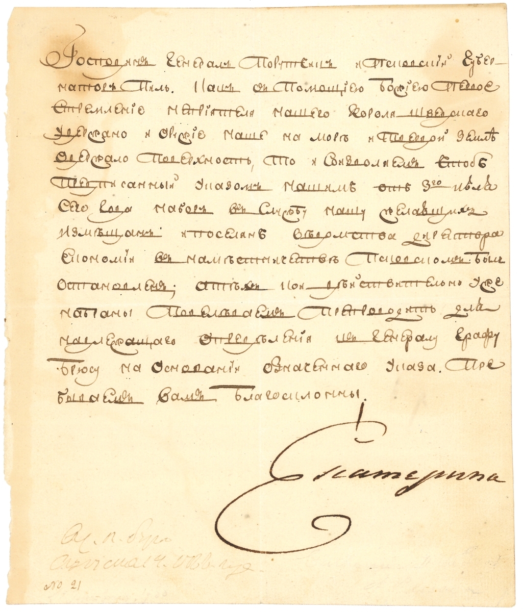 i) Catherine II, 'Catherine The Great', who reigned over Russia between 1762-1796. A single page letter dated to the late 1780s to early 1790s, signed in full "Ekaterina" (in Cyrillic) from Saint Petersburg to Lieutenant General and Governor of Pskov. Contents mention "our enemy the King of Sweden" in reference to the Russian-Swedish War for which men from Pskov would be enlisted.