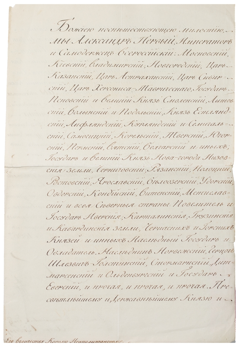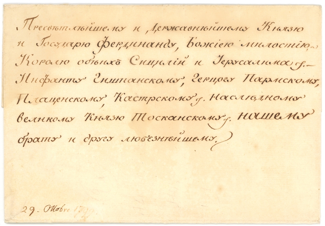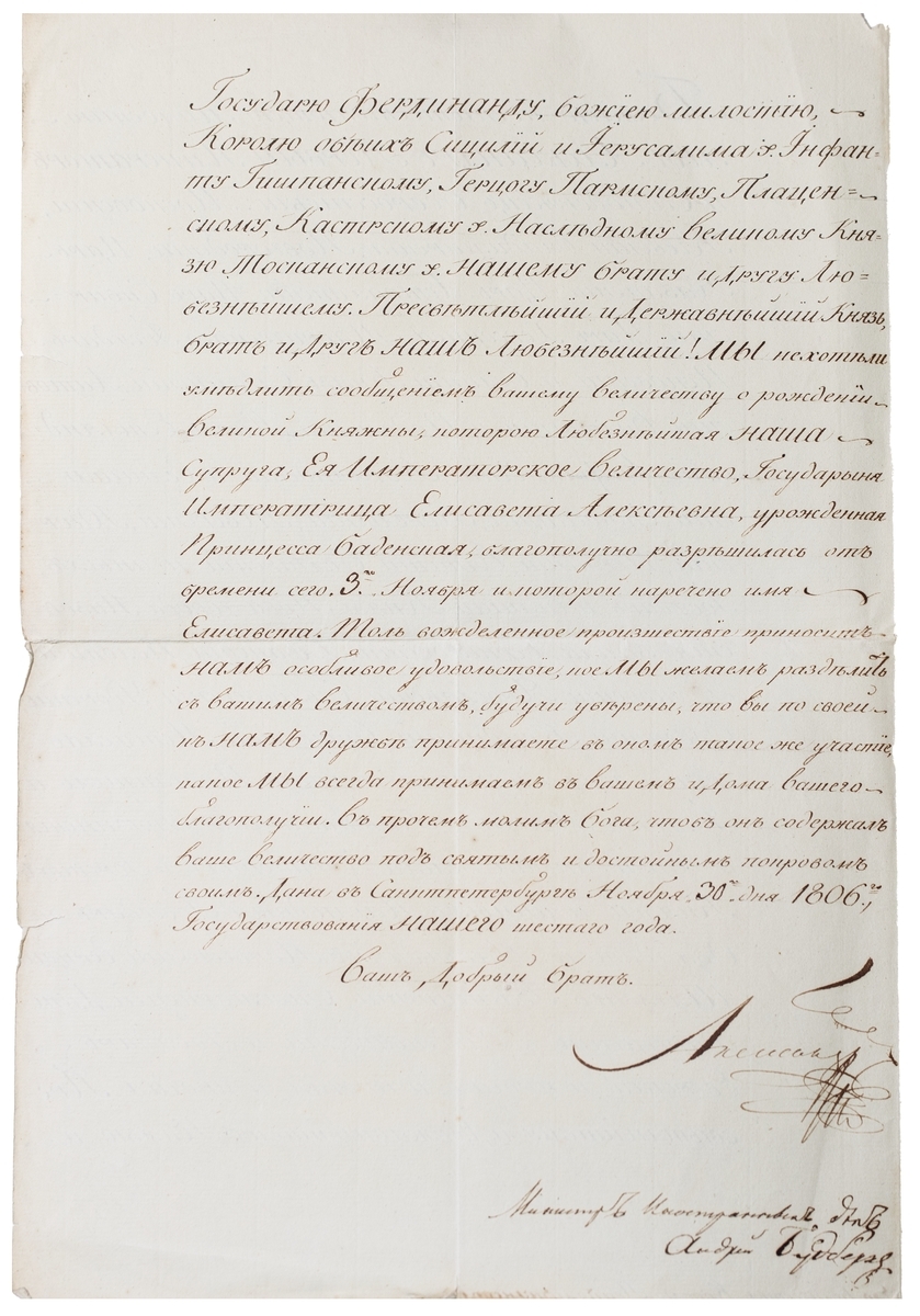 ii) Alexander I, who reigned over Russia between 1801-1825. 1806 (30 Nov.) letter in Russian from St. Petersburg to Ferdinand II, King of the Two Sicilies, announcing the birth of his daughter Elizabeth, signed in full. Together with original cover bearing large wafer seal, now detached.