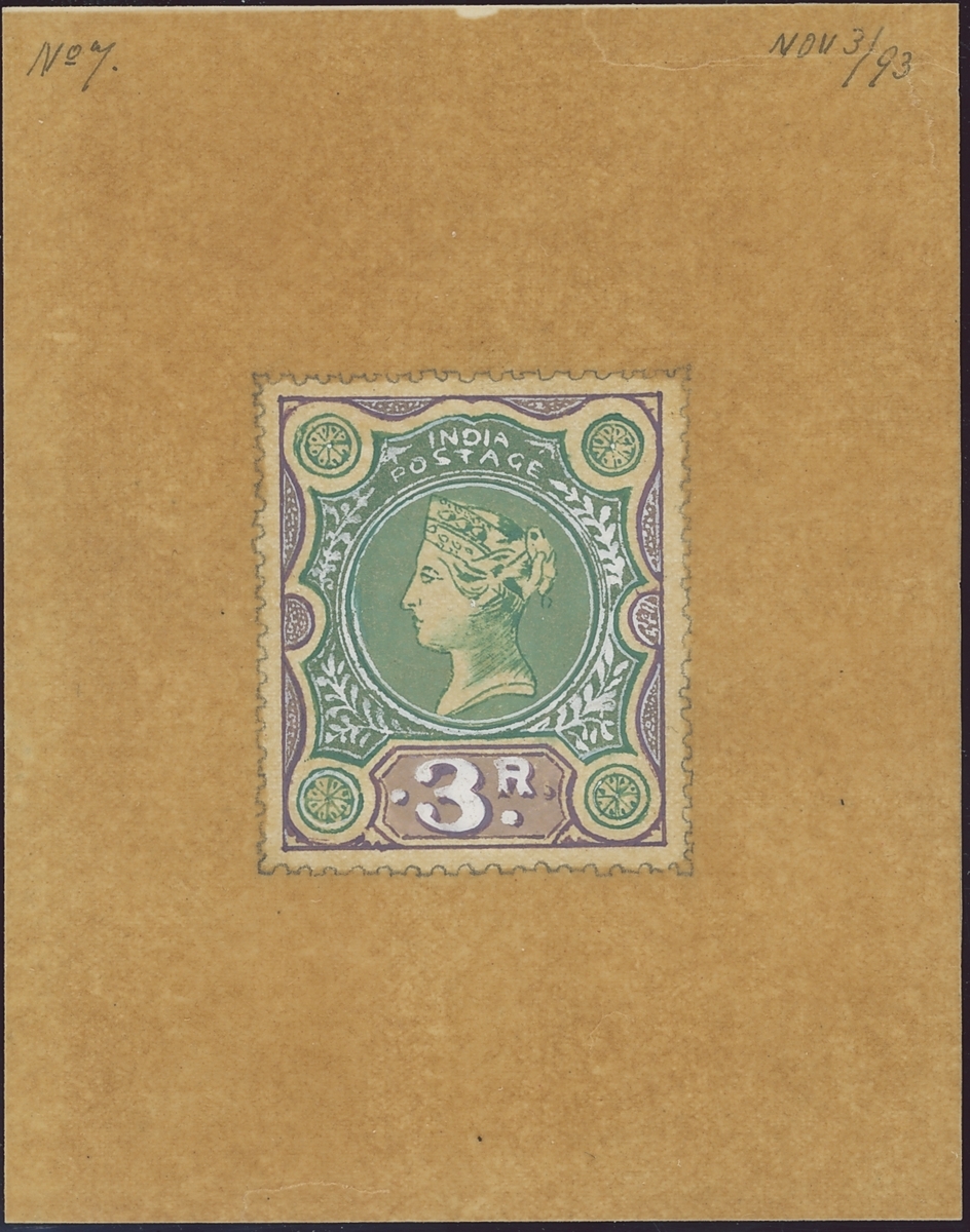 3r. Hand-Painted Essay on Tracing Paper, 1895, in green and mauve and with 'India/ Postage' and the denomination picked out in Chinese white, numbered 'No.7' at upper left, from the original set of ten produced by De La Rue and dated 'nov. 3/93' at upper right, with the Queen's head facing left and with ornate frame, similar to the chosen design for the 1895 high values.
