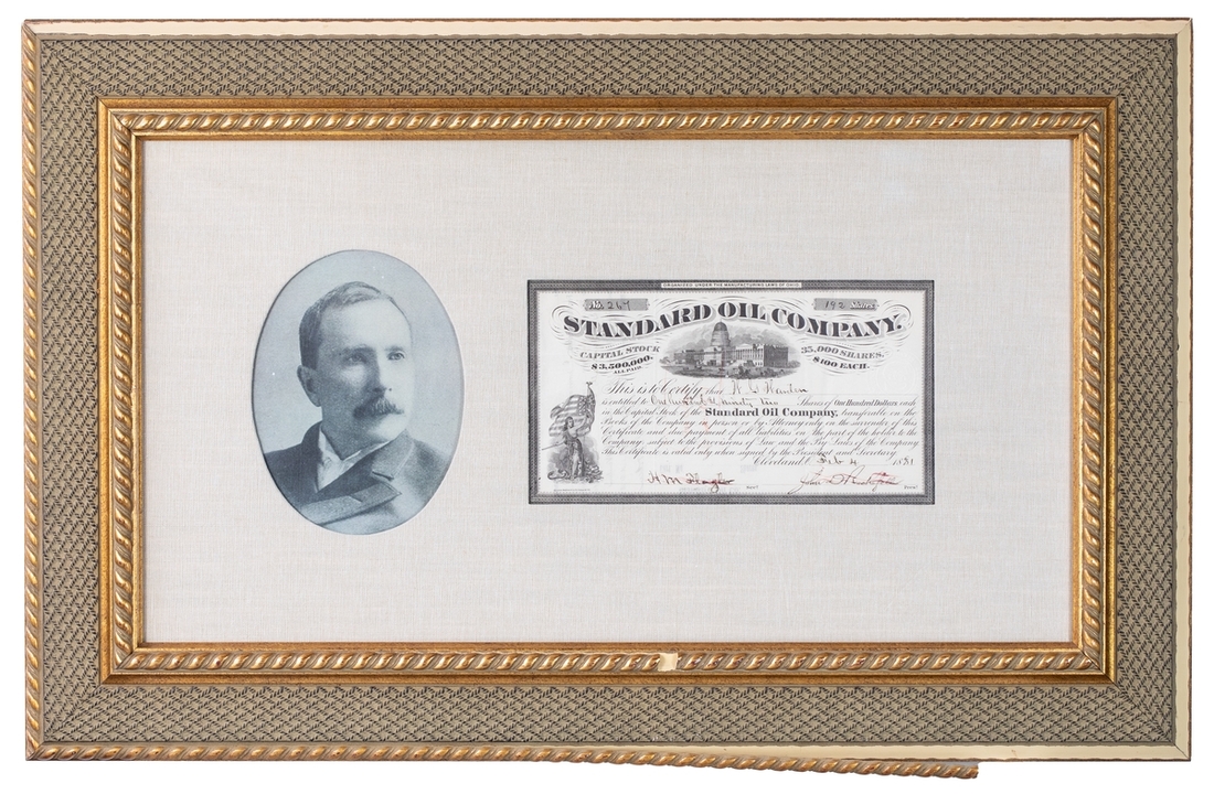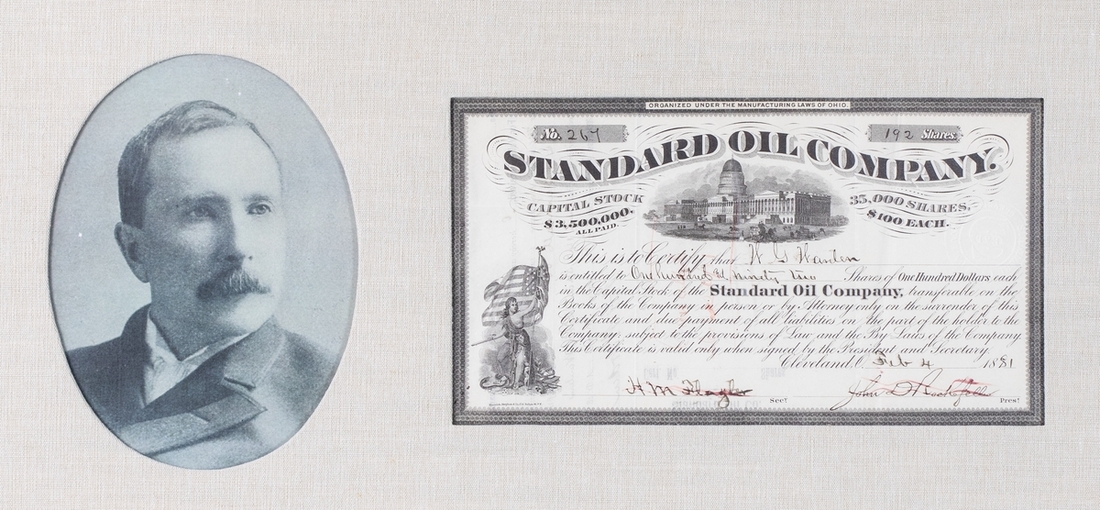 Early in his business career John D Rockefeller (1839-1937) wisely avoided the risks of drilling for oil, and realized the potential of the oil refining business. By following this strategy he became synonymous with big oil in the United States, creating a virtual distribution and refining monopoly, and forcing shippers to offer his company rebates and discounts. Smaller oil refiners had difficulty competing and were bought out by Standard Oil. The sellers often received shares, just like this one. Eventually Rockefeller controlled almost 90% of US refineries. When anti-monopoly laws were passed to preserve competition, Rockefeller formed Standard Oil Trust to work around them. He became the world's first billionaire. Standard Oil Trust certificates signed by Rockefeller are highly collectible; early Standard Oil certificates like this one are rarer still.