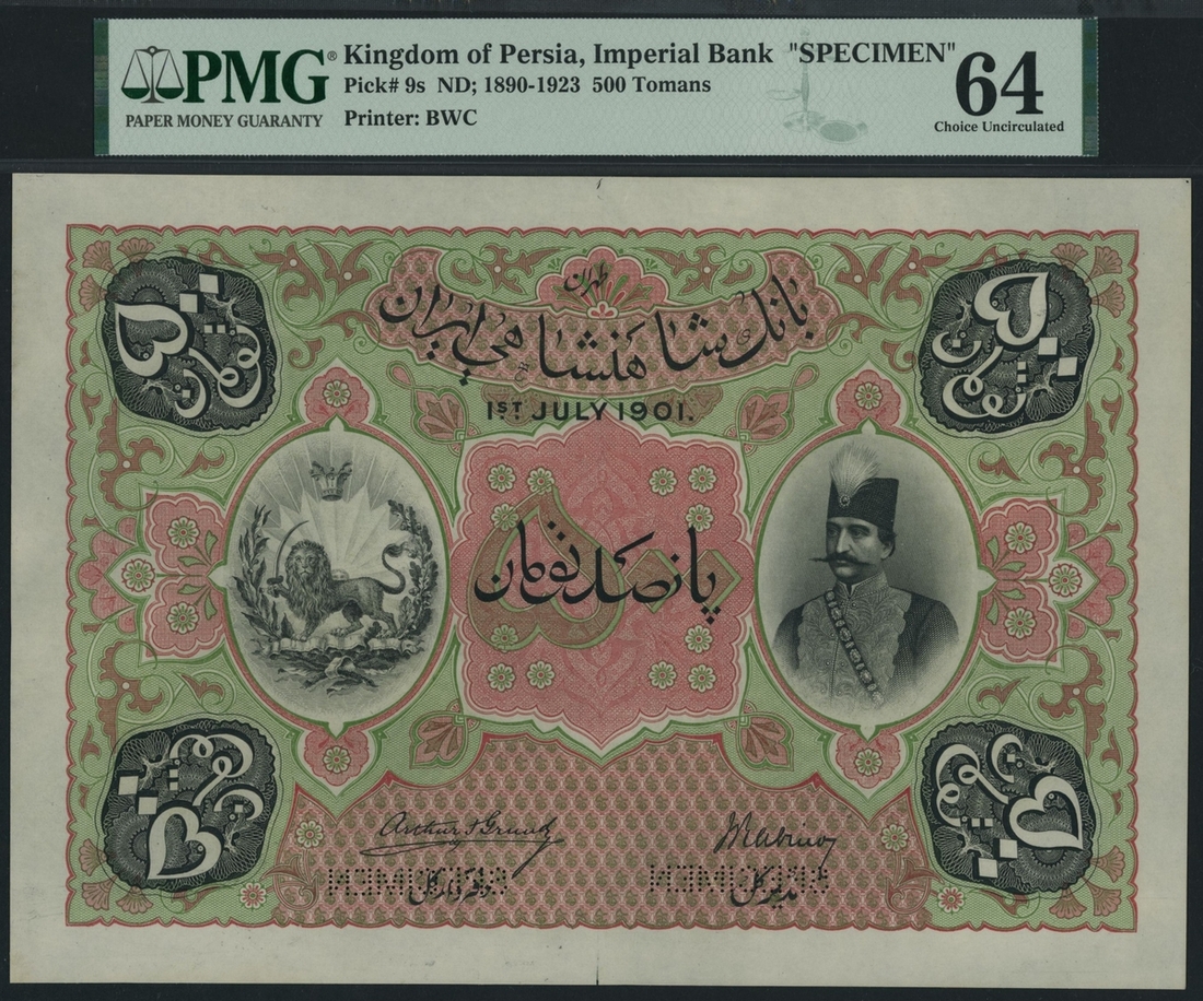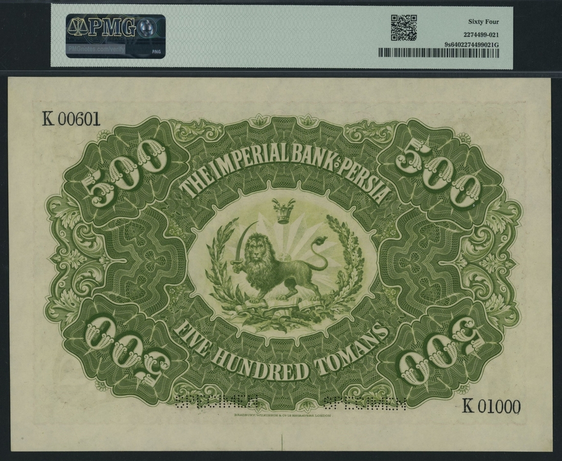 PMG 64 Choice Uncirculated | Imperial Bank of Persia, Specimen 500 Tomans, ND (1890-1923), serial number range K 00601-01000, This note, printed by Bradbury, Wilkinson & Co., has a serial number range of only 400 pieces with a horizontal specimen perforation. The pink and green obverse of the banknote highlights the denomination in Farsi script at the centre and in all four corners. The date 1st July 1901 is printed in the mid-top centre, accompanied by the signatures of Arthur F. Frundy and Joseph Rabino positioned at the lower centre. A vignette to the mid-right presents a portrait of Nasr-ed-Din in traditional Persian military attire with a fez, while the mid-left vignette displays the symbol of the Qajar dynasty: a crowned lion brandishing a sword against a sunlit backdrop. This emblem reappears at the centre of the reverse side, accompanied by English text. The serial number K 00601 is printed in the top left corner, and serial number K 01000 in the bottom right, (Pick 9s).
