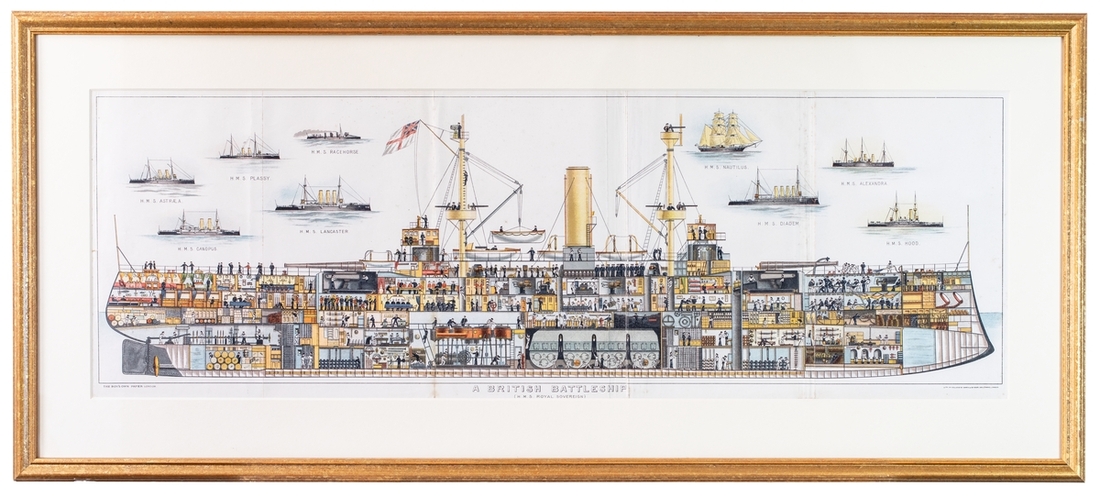 Framed Lithograph of a British Battleship, H.M.S. Royal Sovereign, Royal Navy 1st Class Battleship, Pre Dreadnought type, c. 1892, by Emrik and Singer, The Strand, London, cut away of the ship, surrounded by other Royal Navy contemporary ships.