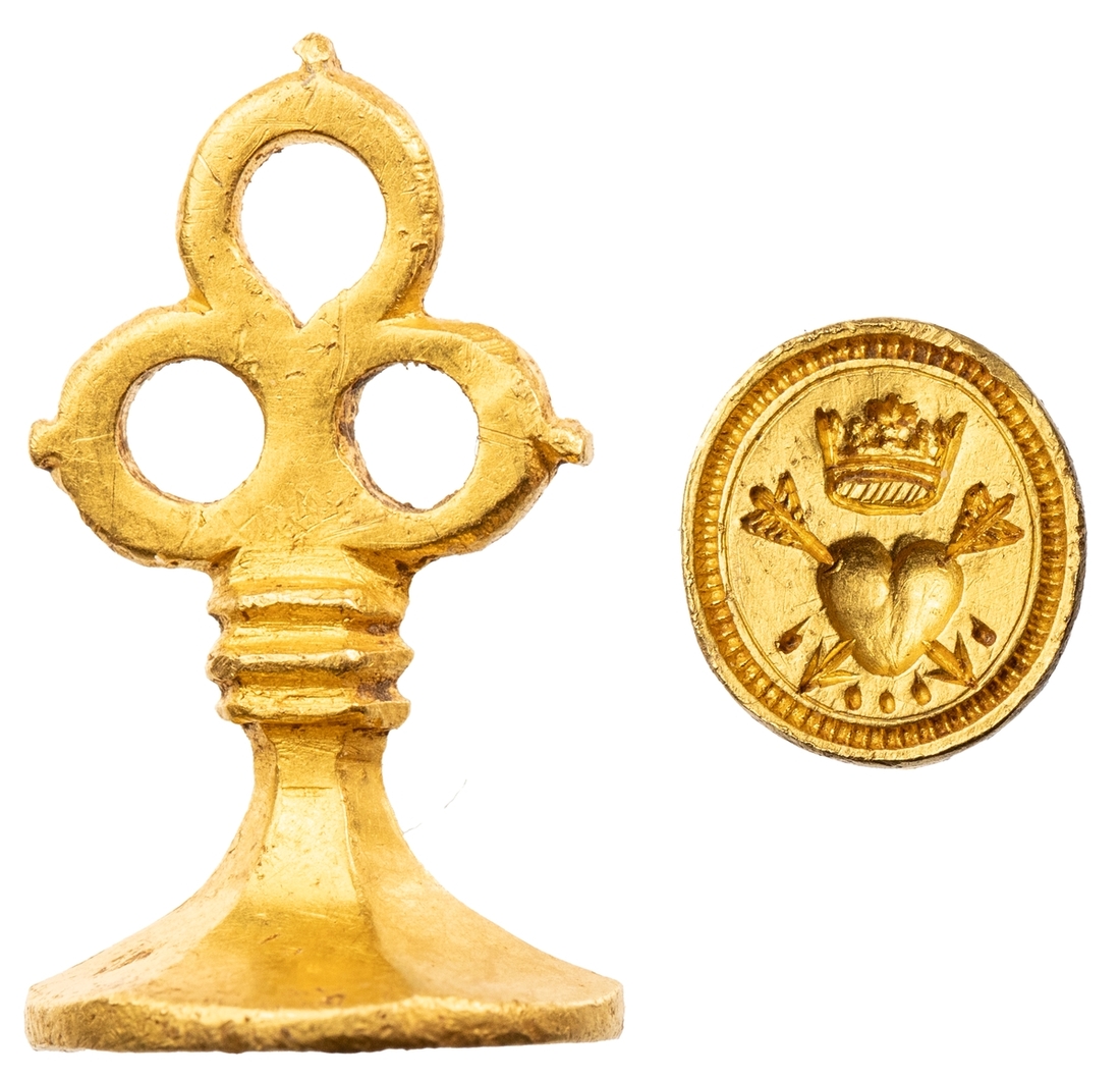 Gold Seal Matrix, (c.1662), thought to have been struck to celebrate the marriage of King Charles II and Catherine of Braganza, uninscribed, long stem culminating in an openwork handle of flattened trefoil shape, pierced with three small holes, the face depicts a heart pierced by two arrows, with drops of blood beneath, above lies a crown, 17 x 10 x 8mm, 2.92g (PAS: BUC-4AD125 this seal, cf. SWYOR-A48F92, Silver examples: cf. SUSS-8A6B12, BUC-0A3C95, DUR-77ED15, LVPL-9F73EC, NMS-7894E6, BUC-892044; V&A: M.96-1962).