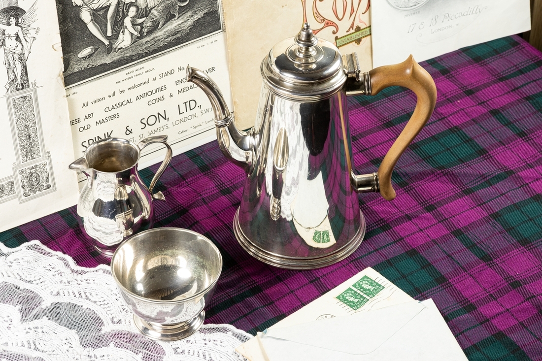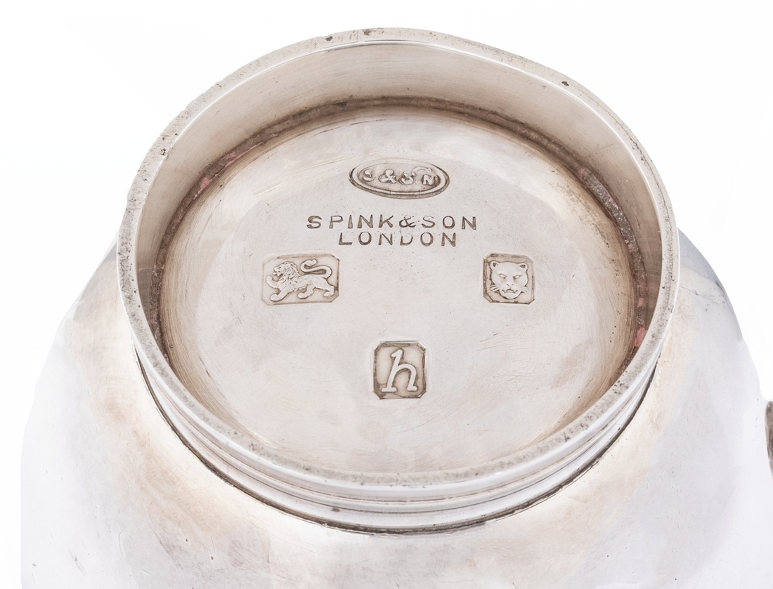 Silver George I Style Coffee Set, 1963, London, by Spink and Son Ltd, comprising coffee pot, milk jug and sugar bowl, hallmarked, with Spink makers mark.