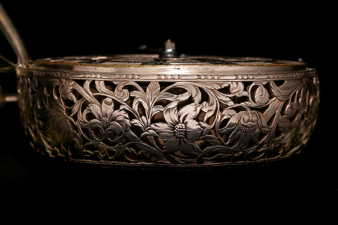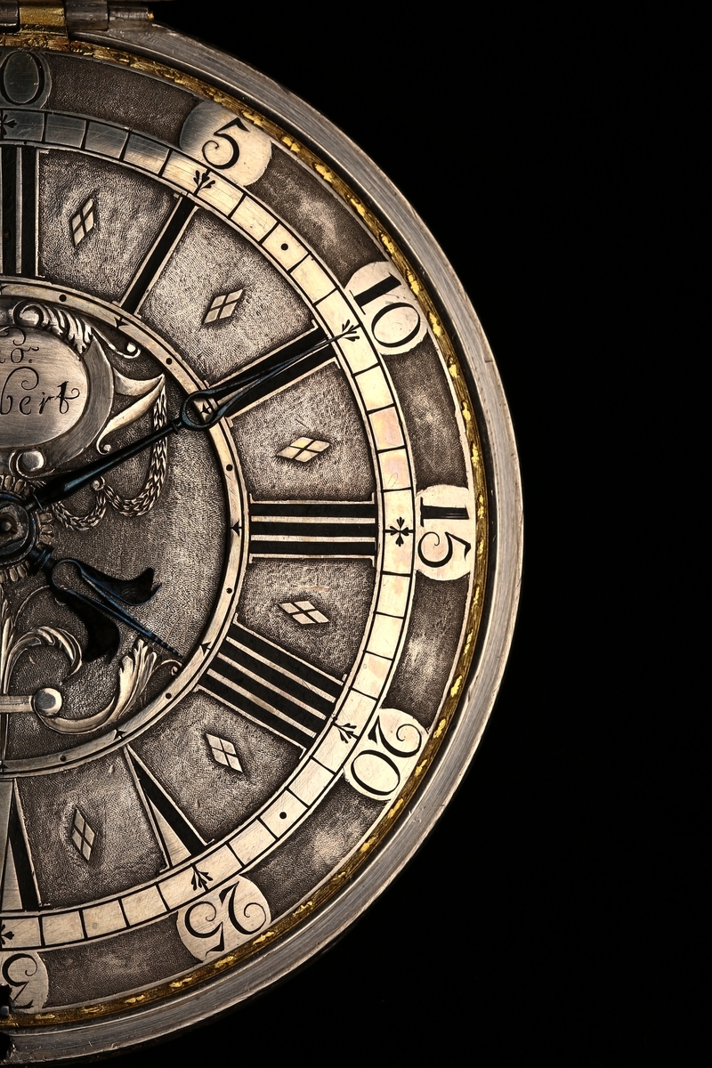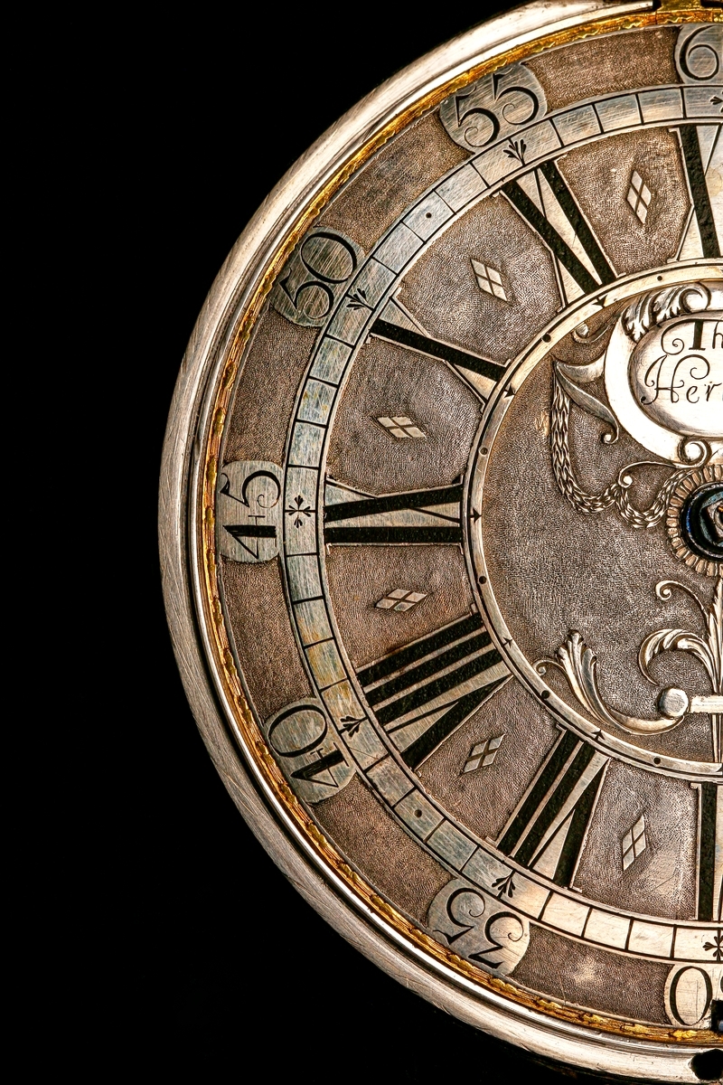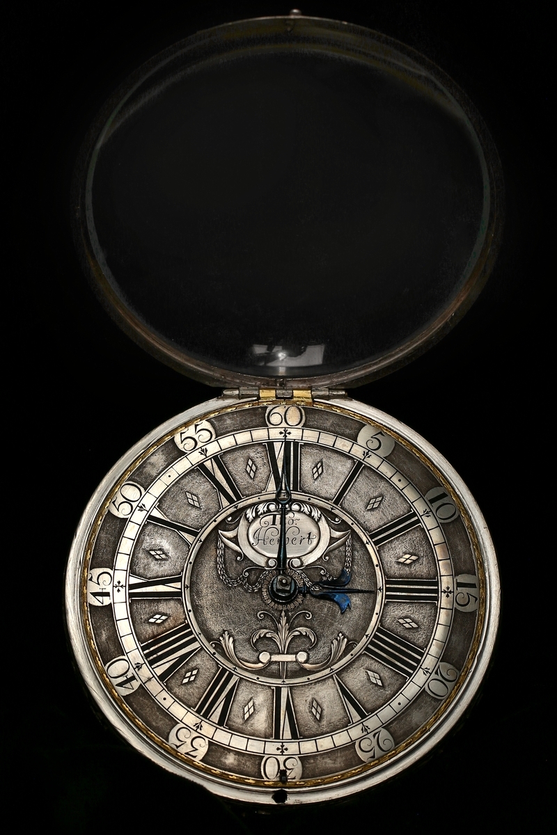 This watch may have hung in the King's bedchamber. Herbert supplied alarm clocks 'of custom allowed to the seven pages of the King's bedchamber every third year'. However, with no alarm, this exceptionally large watch may have been for the King's personal use. Likewise, on the day of his execution in 1649, King Charles I had gifted to an attendant 'the silver Clock that hung by the Bedside'. Now in the Royal Collection, that clock watch was made by Herbert's father-in-law Edward East.