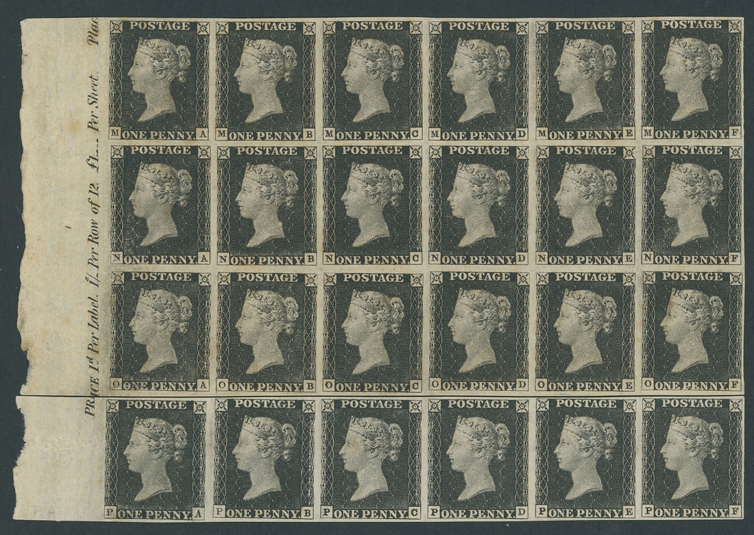 Great Britain, 1840 One Penny Black, Plate 1b, Multiple of Twenty-Four comprising an MA-OF marginal block of eighteen from the left of the sheet, MF showing double letter 'M', with part sheet inscription "[