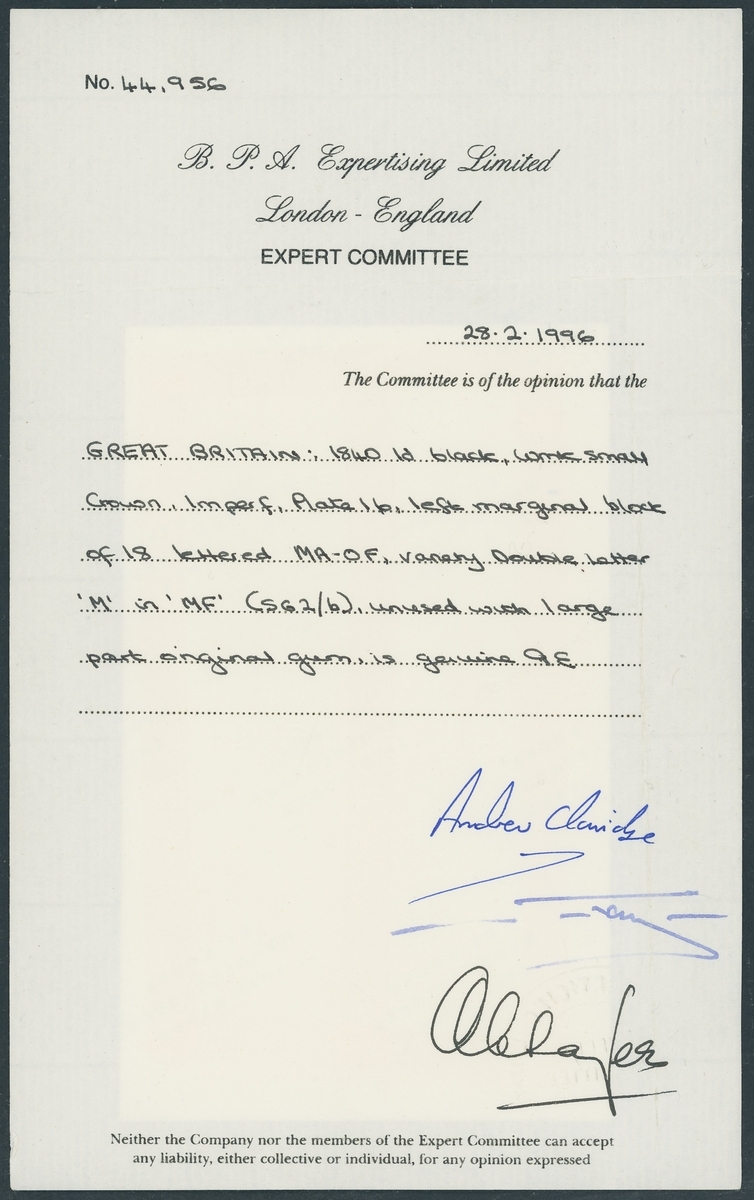 In philatelic terms, the relative importance of this classic rarity cannot be overstated. Comparably, for the first two stamps of Great Britain, there are very few known mint multiples of this size remaining outside institutional collections. Of the Penny Black, The R.M. Philips Collection in the British Postal Museum houses a number of multiples including their largest, a block of forty-three 1d. black from Plate 3 and an equivalent block of twenty-four from Plate 1b; there exists another block of eighteen in private hands, and a block of twenty-four from Plate 7. In addition there is a larger block of 'V.R.' stamps, though the multiple shown here can be considered the largest multiple of the 1d. black from Plate 1b, and the joint largest multiple of the 1d. black from Plates 1-11 in private hands. From the Two Pence Blue printings, The Buccleuch block of forty-eight 2d. blue from Plate 2 is the largest block of this stamp in existence, sold by Spink privately for a seven figure sum; the Royal Collection houses a 2d. blue block of thirty-eight, .