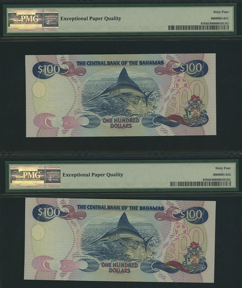 (x) Central Bank of the Bahamas, [3 notes] $100, 2000, consecutive serial numbers L726404-5 and L726407, (Pick 67, BNB 333), all in PMG holders 64 EPQ Choice Uncirculated (3 notes)