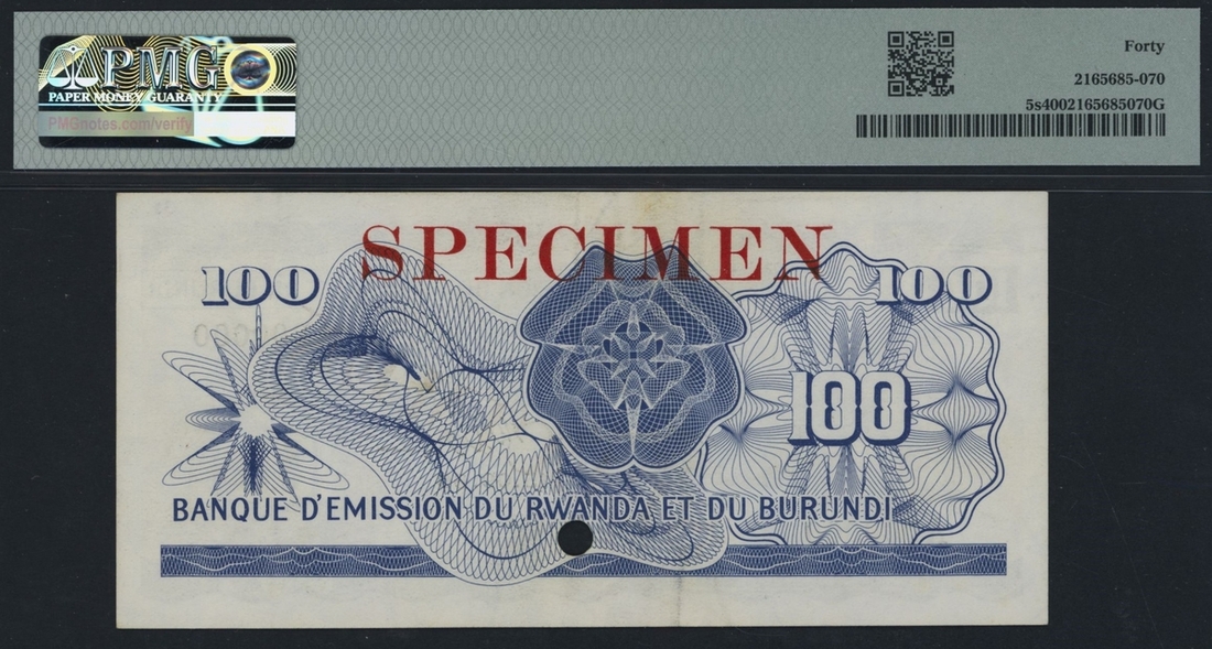 (x) Banque d'Emission du Rwanda et du Burundi, specimen 100 Francs, 15.09.60, serial number A000000, (Pick 5s, BNB 105as), in PMG holder 40 Extremely Fine