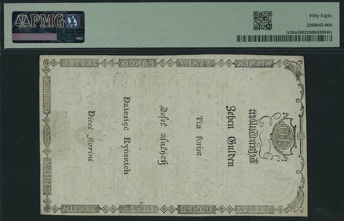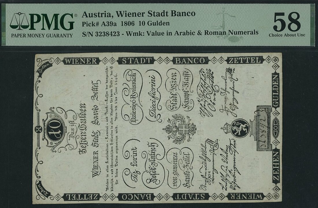 Wiener Stadt Banco, Austria, *TOP POP* 10 Gulden, 1st June 1806, serial number 3238423, (Pick A39a), in PMG holder 58 Choice About Uncirculated, tied with 1 other note for finest graded on PMG census