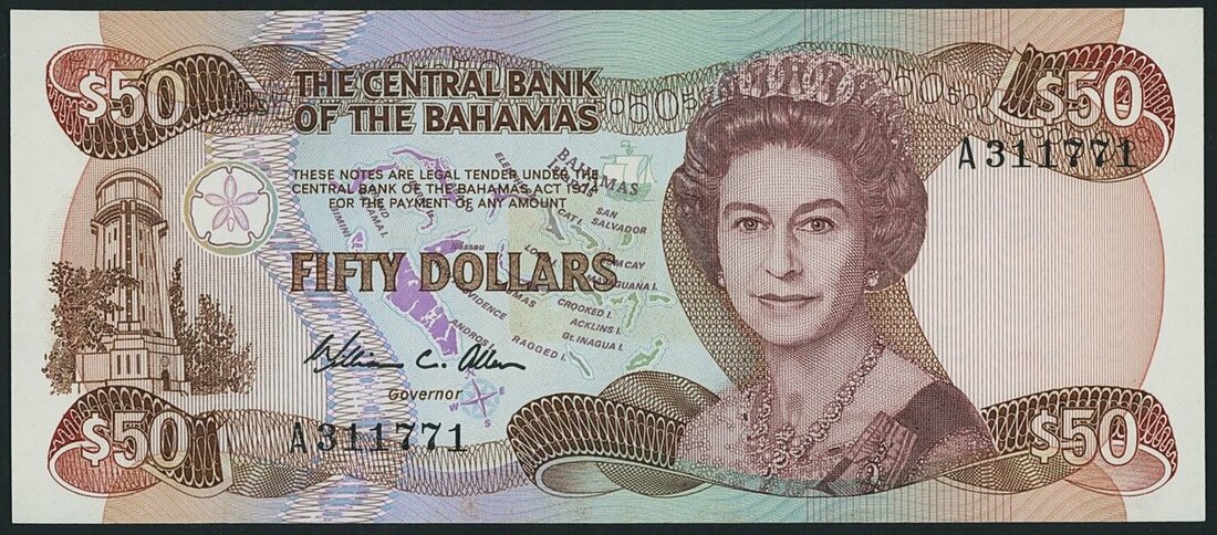 Central Bank of the Bahamas, 50 Dollars, 1974, serial number A311771, (Pick 48a), uncirculated