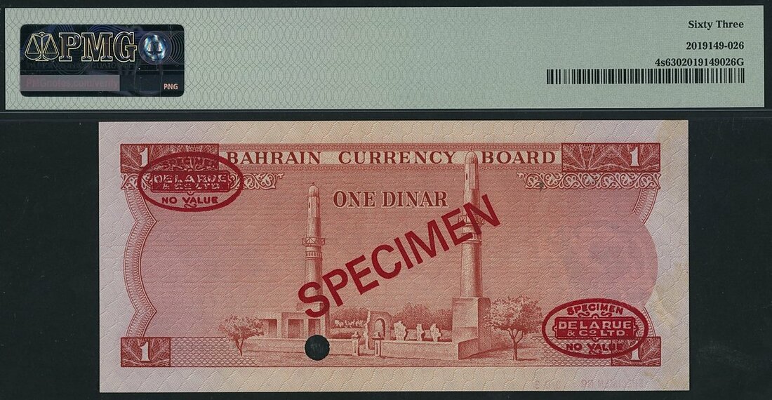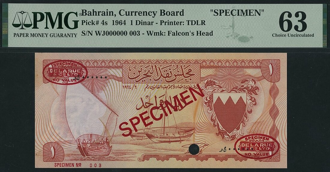 Bahrain Currency Board, specimen 1 Dinar, 1964, specimen number 003, De La Rue overprint,