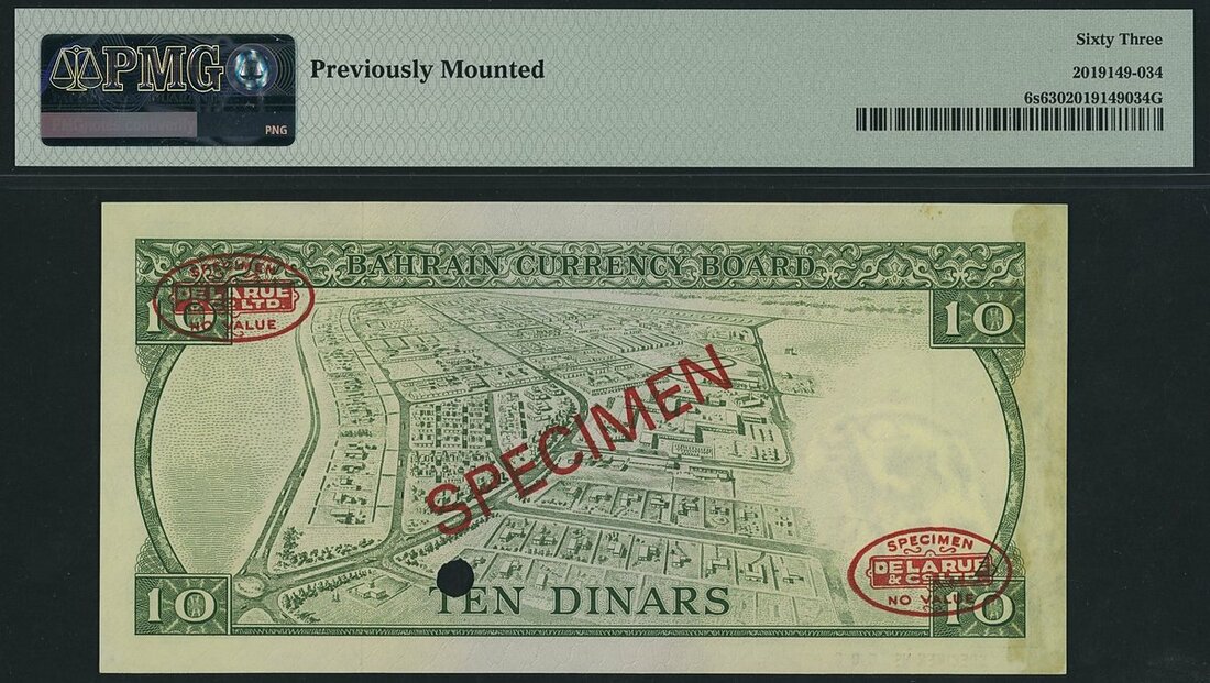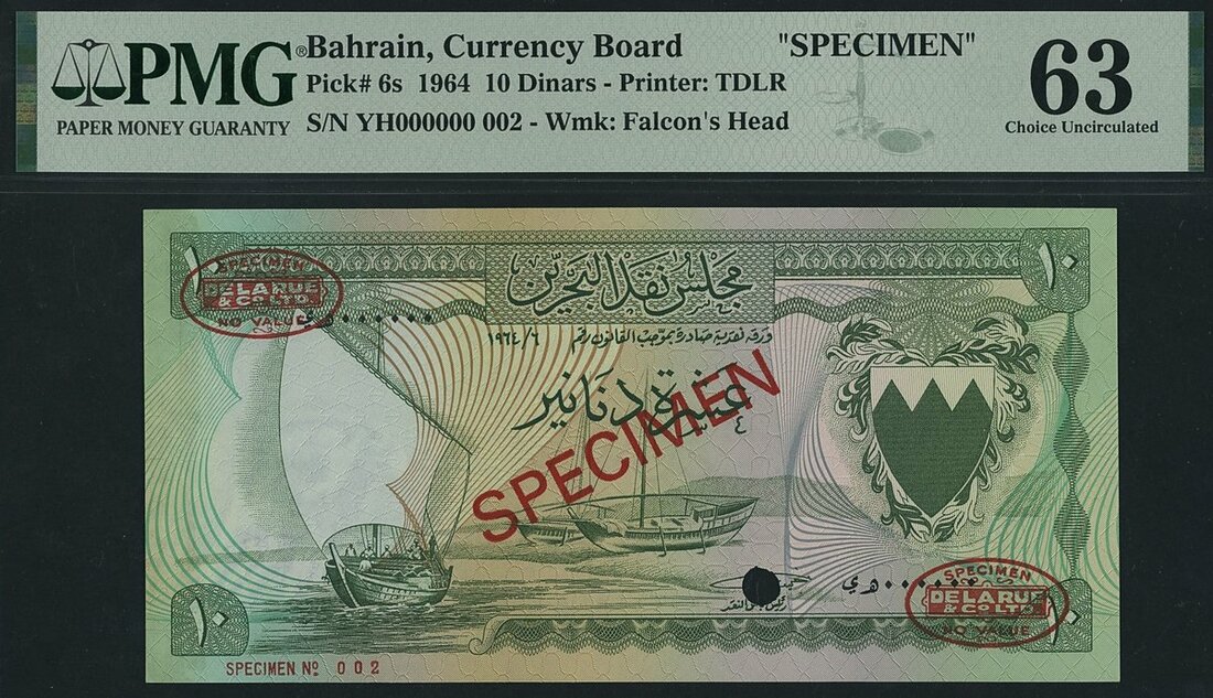 Bahrain Currency Board, specimen 10 Dinars, 1964, specimen number 002, De La Rue overprint,