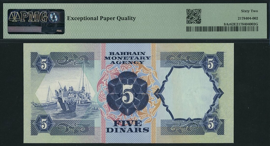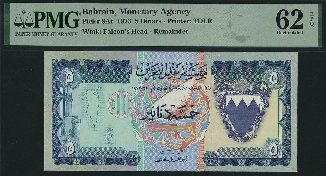 Bahrain Monetary Agency, remainder 5 Dinars, 1973, (Pick 8Ar), in PMG holder 62 EPQ Uncirculated, only 7 notes in higher grades on PMG census, scarce as remainder