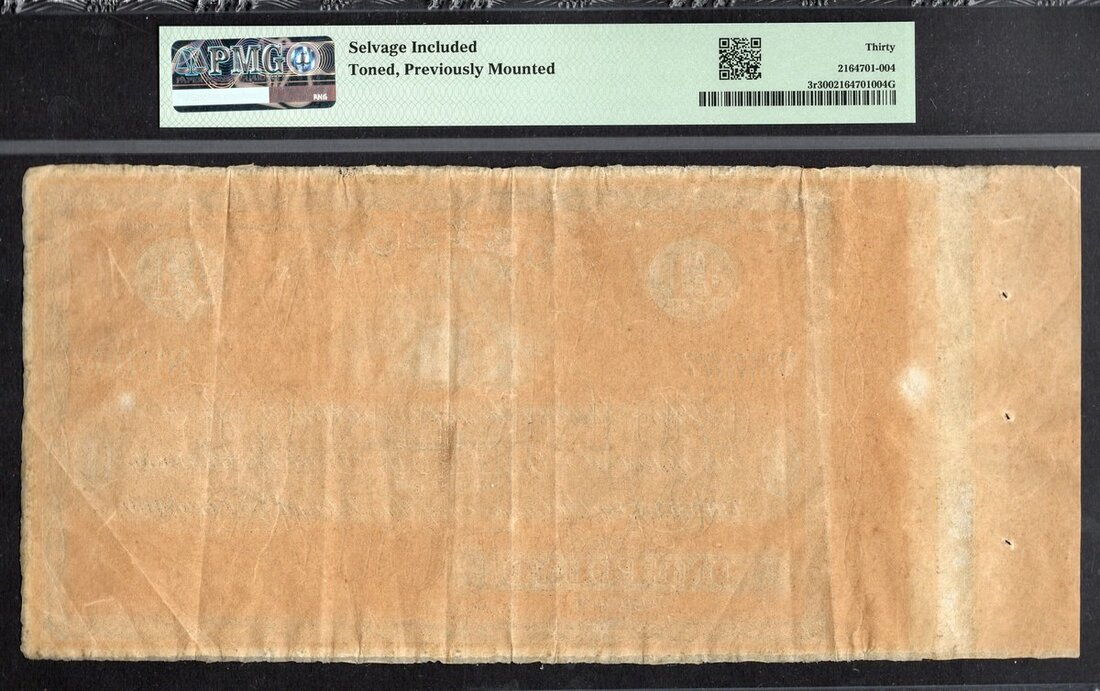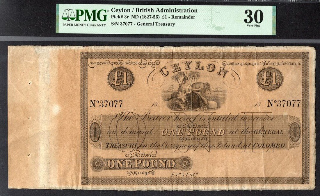 British Administration, Ceylon, remainder 1 Pound, ND (1827-1856), serial number 37077, (Pick 3r, BNB 101), in PMG holder 30 Very Fine, selvage included, toned, previously mounted, rare