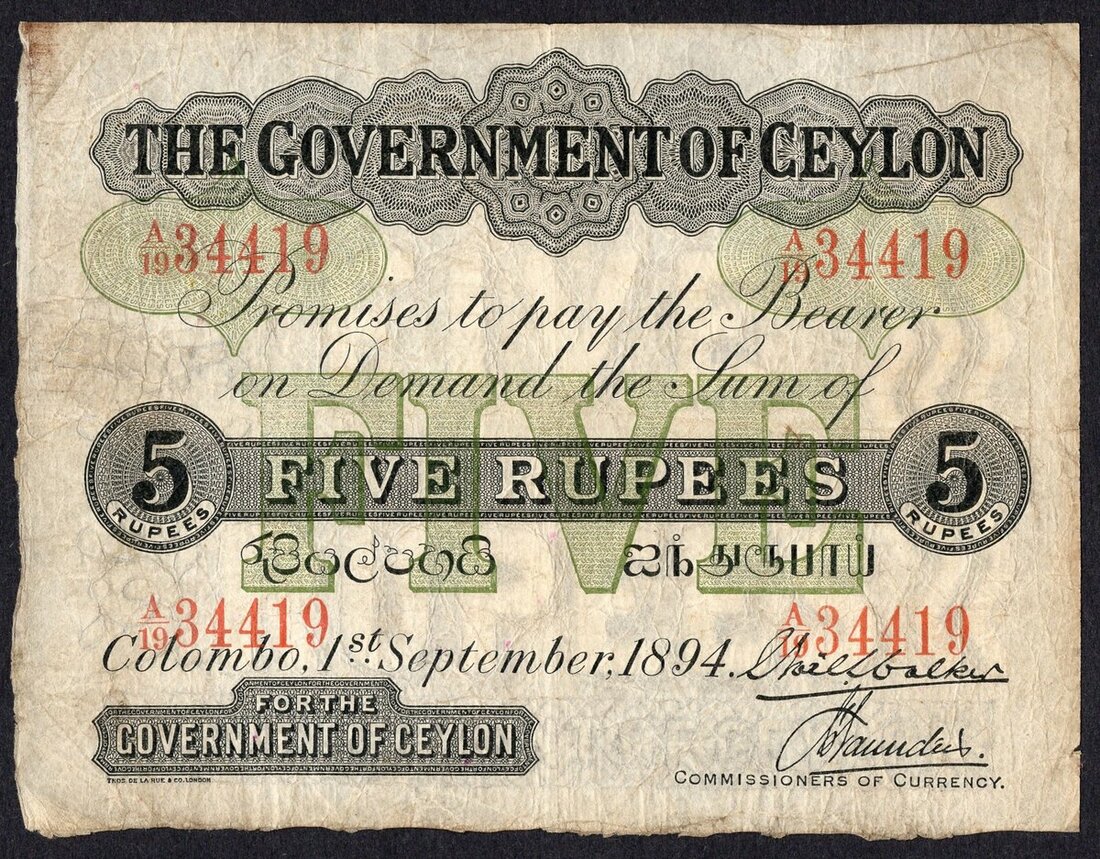 (x) Government of Ceylon, 5 Rupees, Colombo, 1st September 1894, serial number A/19 34419, (Pick 11a), fine, some light staining and marks, mostly an attractive example of this rare early type