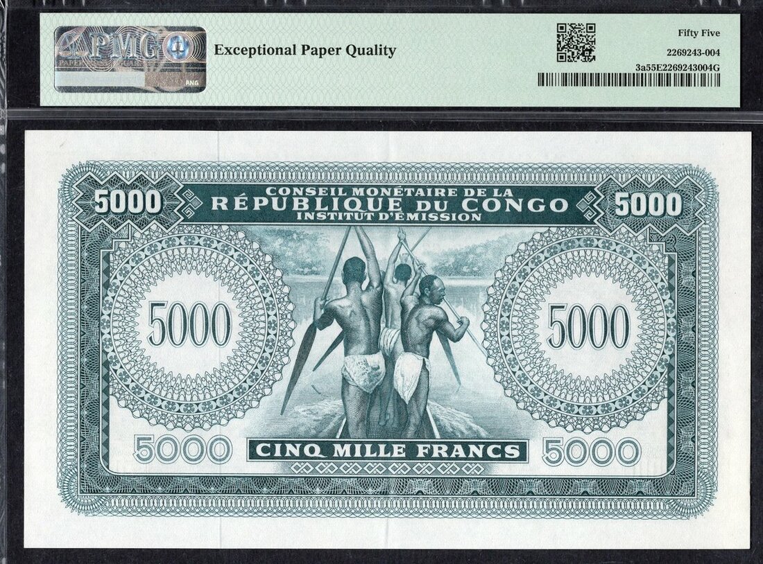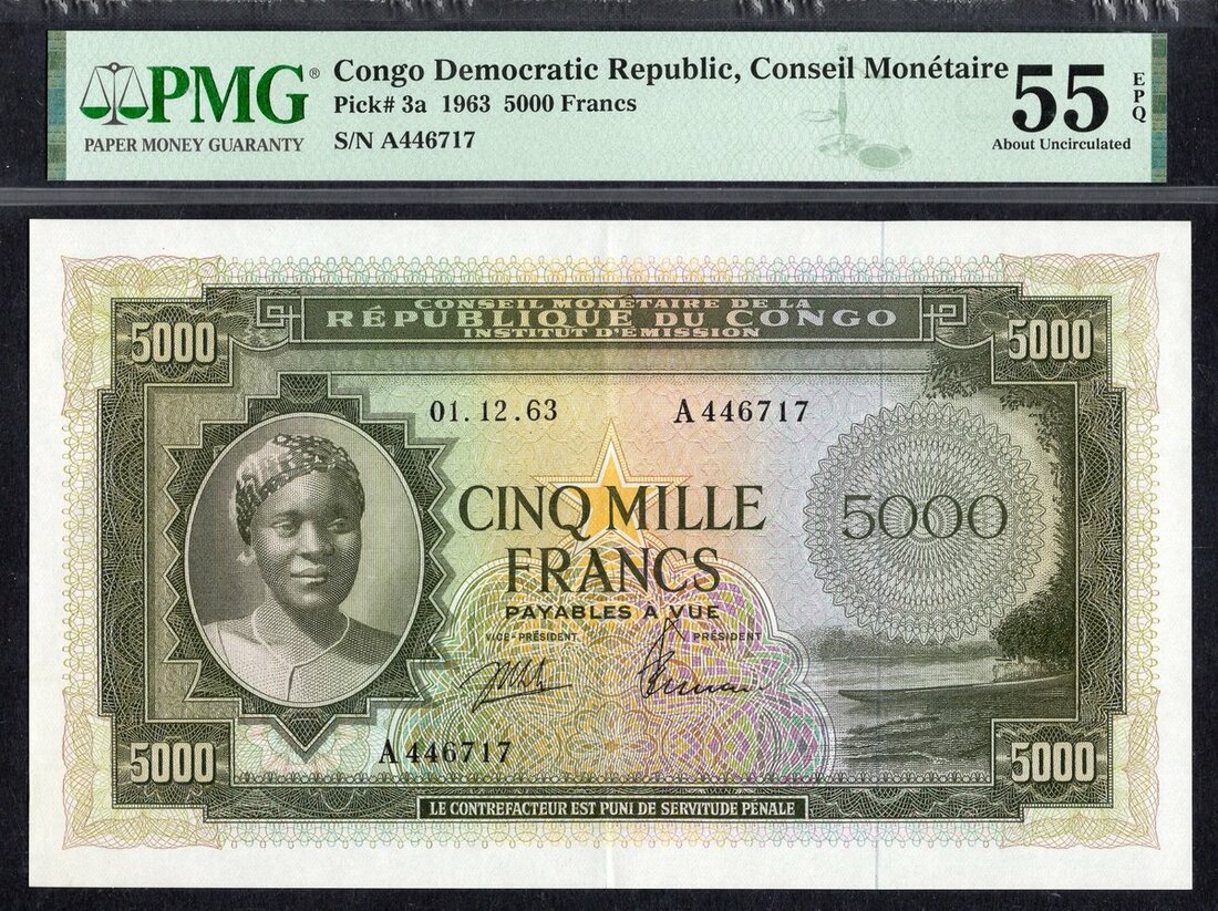 (x) Conseil Monétaire, Democratic Republic of Congo, *TOP POP* 5000 Francs, 1st December 1963, serial number A446717, (Pick 3a), in PMG holder 55 EPQ About Uncirculated, tied with only 1 other note for finest graded on PMG census, rare in this grade