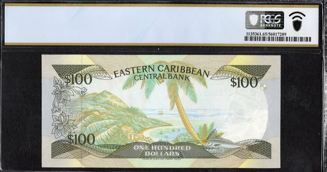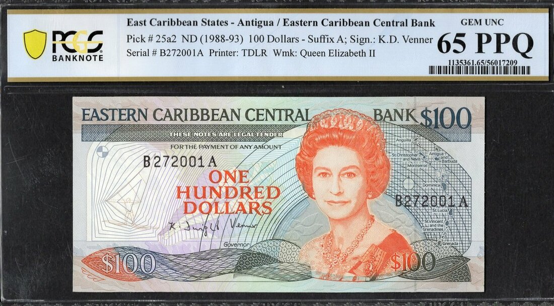 Eastern Caribbean Central Bank, Antigua, 100 Dollars, ND (1988-93), serial number B272001A, (Pick 25a2), in PCGS holder 65 PPQ Gem Uncirculated