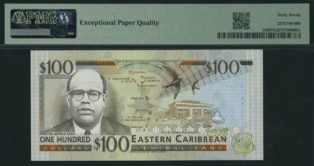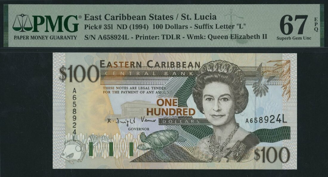 Eastern Caribbean Central Bank, St. Lucia, *TOP POP* 100 Dollars, ND (1994), serial number A658924L, (Pick 35l), in PMG holder 67 EPQ Superb Gem Uncirculated, the single finest graded on PMG census