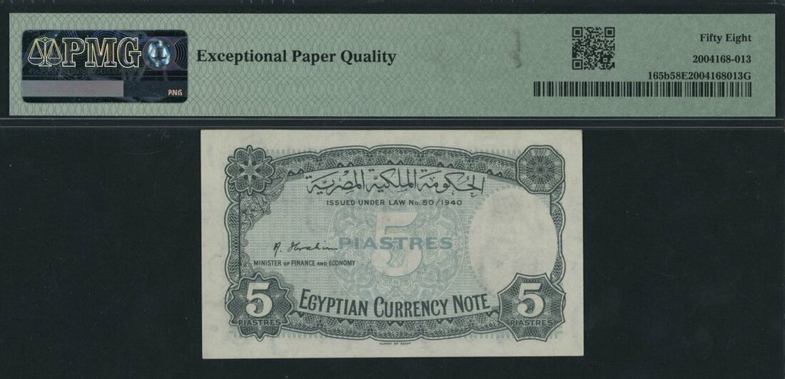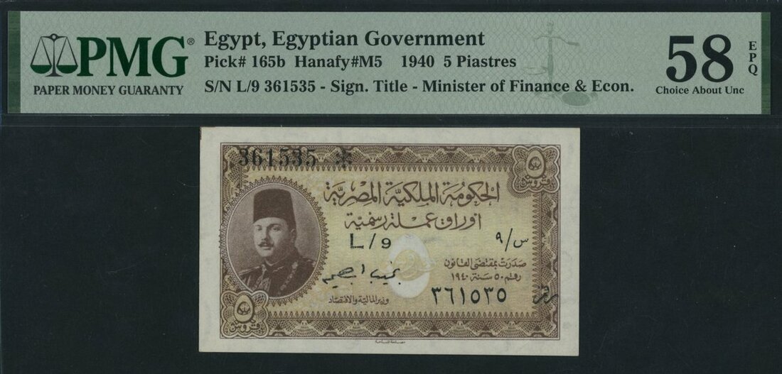 (x) Egyptian Currency Note, 5 Piastres, 1940, serial number L/9 361535, Minister of Finance & Economy title, Ibrahim signature,