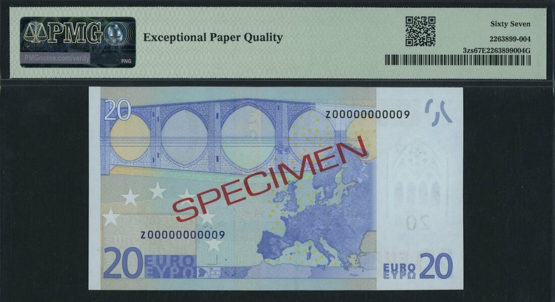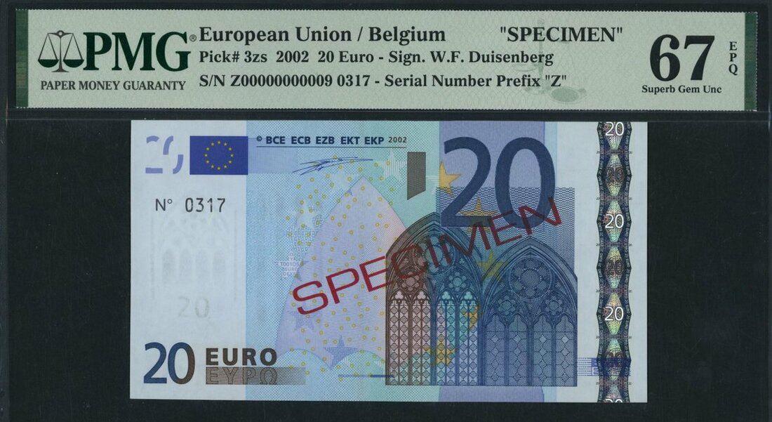 European Union, Belgium, *TOP POP* specimen 20 Euro, 2002, specimen number 0317, (Pick 3zs), in PMG holder 67 EPQ Superb Gem Uncirculated, tied with 2 other notes for finest graded on PMG census