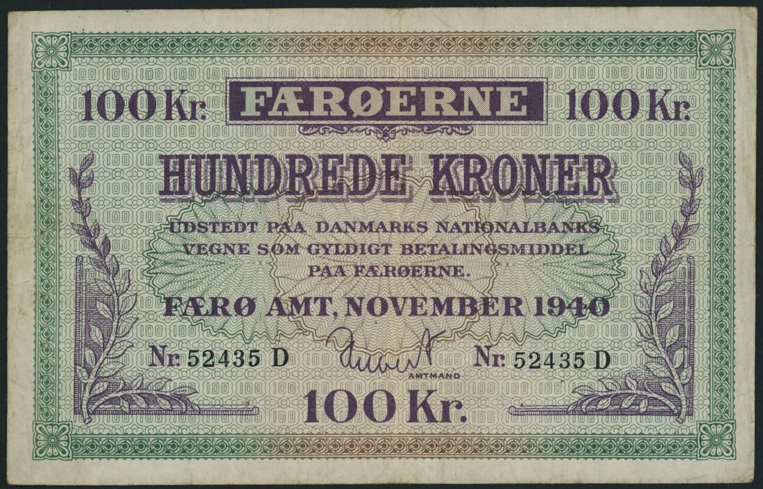 (x) Faroe Islands, 100 Kroner, November 1940, serial number 52435 D, second emergency issue,