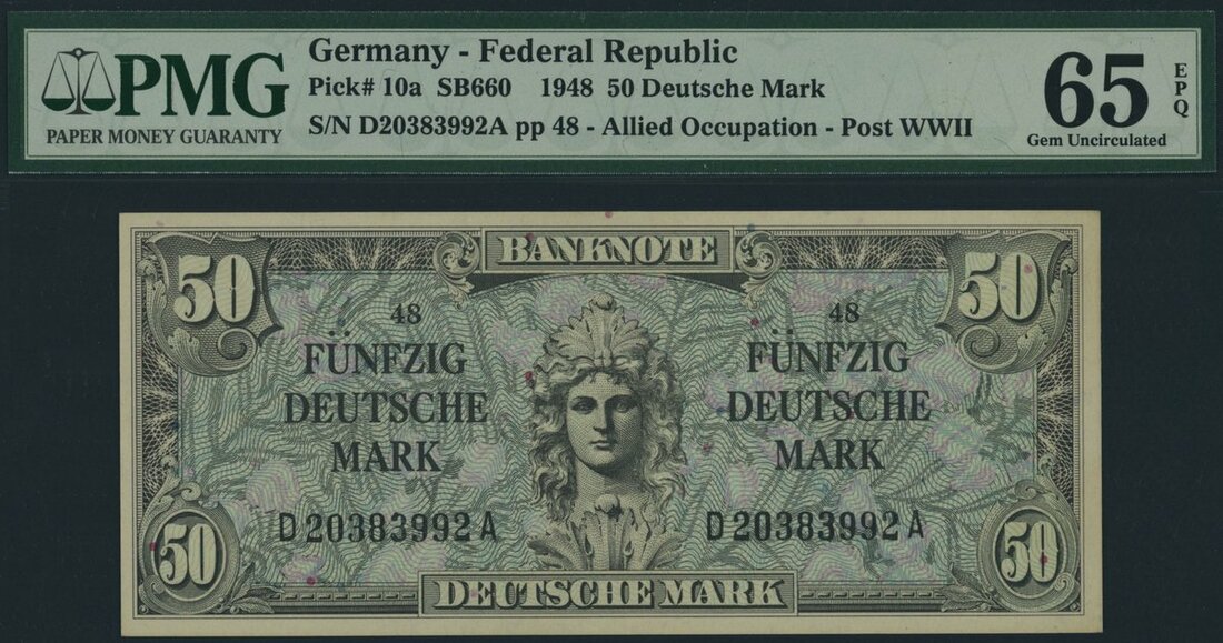 (x) Germany Federal Republic, Allied Occupation, 50 Deutsche Mark, 1948, serial number D20383992A,