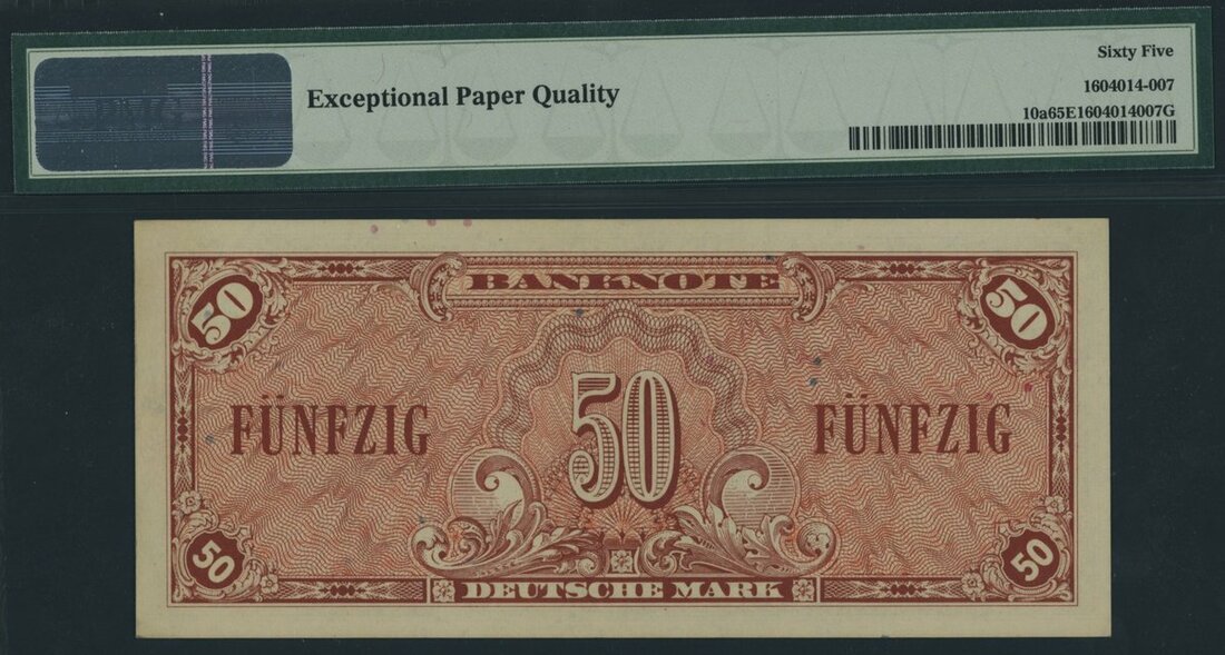 The higher denominations of the Tudor Press series, including the 50 Deutsche Mark, were soon withdrawn due to inadequate security features and vulnerability to counterfeiting. The 50 Deutsche Mark Pick 10a is regarded as the rarest post-war German banknote, a status further enhanced when encountered in this exceptional condition.
