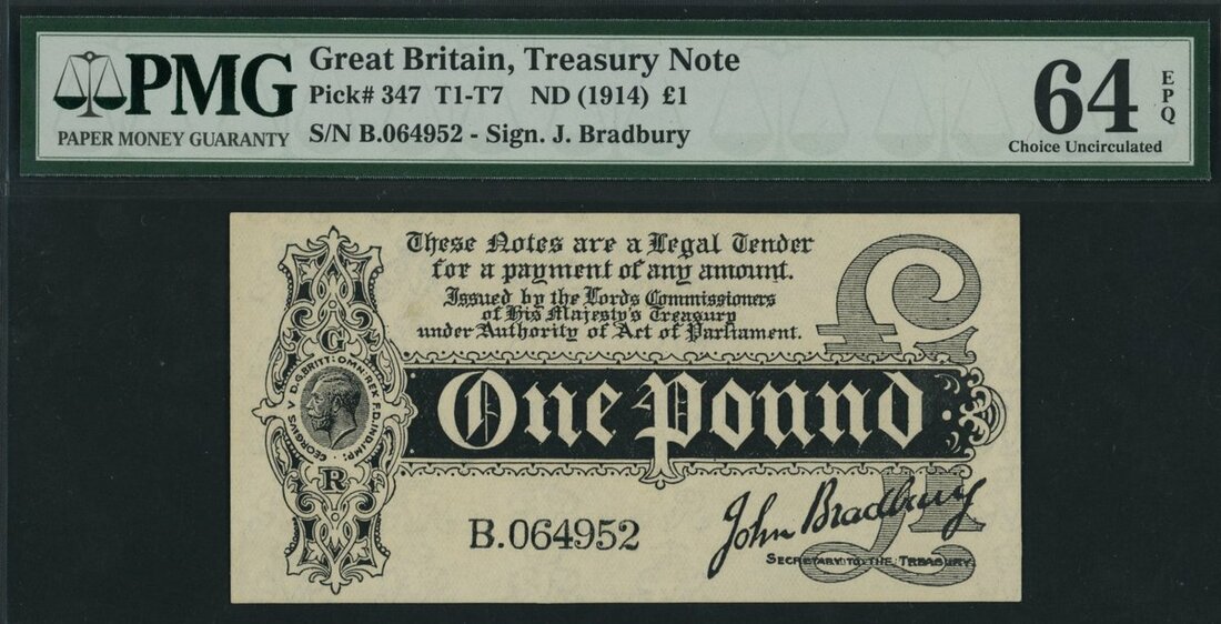 Treasury Series, John Bradbury, £1, ND (1914), serial number B.064952, (EPM T1), in PMG holder 64 EPQ Choice Uncirculated, Ex Lou Manzi Collection, very rare in this exceptional grade