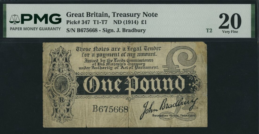 Treasury Series, John Bradbury, £1, ND (1914), serial number B675668, (EPM T2), in PMG holder 20 Very Fine, splits, repaired