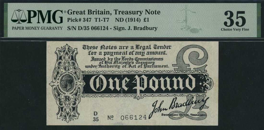 Treasury Series, John Bradbury, £1, ND (1914), serial number D/35 066124, (EPM T5.3a), in PMG holder 35 Choice Very Fine, previously mounted
