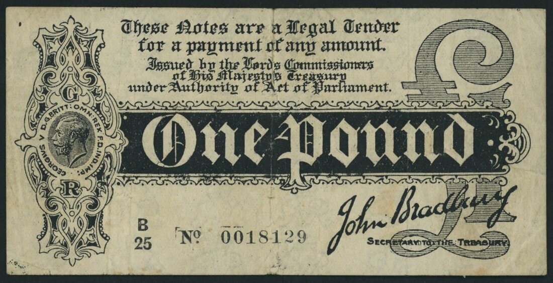 Treasury Series, John Bradbury, £1, ND (1914), serial number B/25 0018129, (EPM T5.4b), very good, tears, one vertical into centre