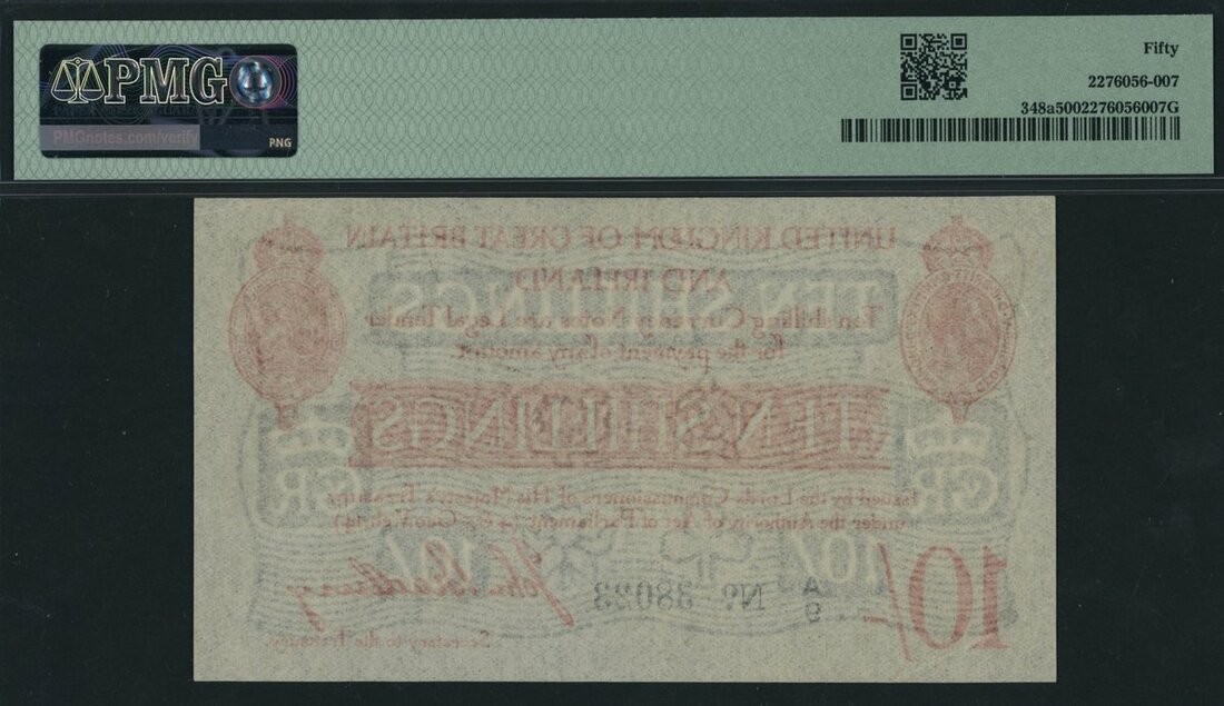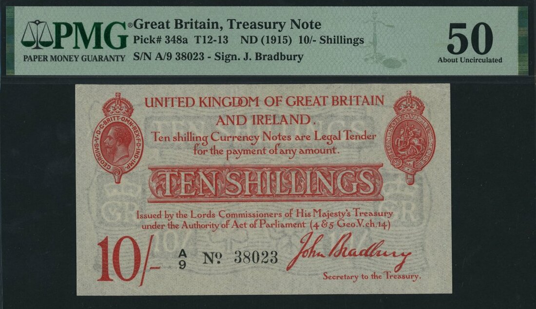 Treasury Series, John Bradbury, 10/- Shillings, ND (1914), serial number A/9 38023, (EPM T12.1), in PMG holder 50 About Uncirculated, scarce in this grade