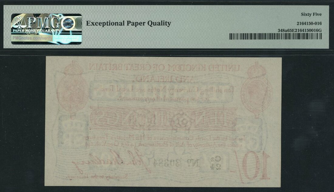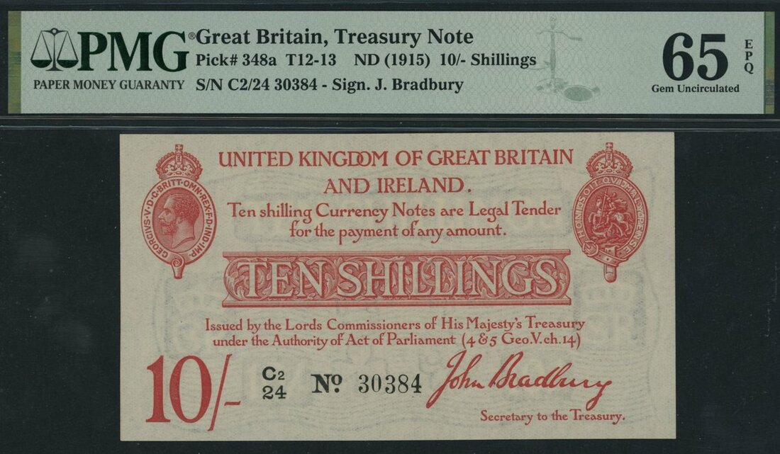 Treasury Series, John Bradbury, 10/- Shillings, ND (1914), serial number C2/24 30384, (EPM T12.3), in PMG holder 65 EPQ Gem Uncirculated, final prefix and a rare excellent grade
