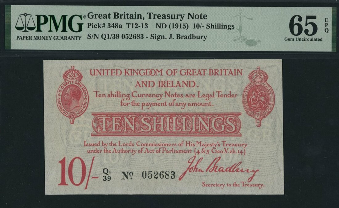 Treasury Series, John Bradbury, 10/- Shillings, ND (1914), serial number Q1/39 052683, (EPM T13.2), in PMG holder 65 EPQ Gem Uncirculated, rare in such an outstanding high grade