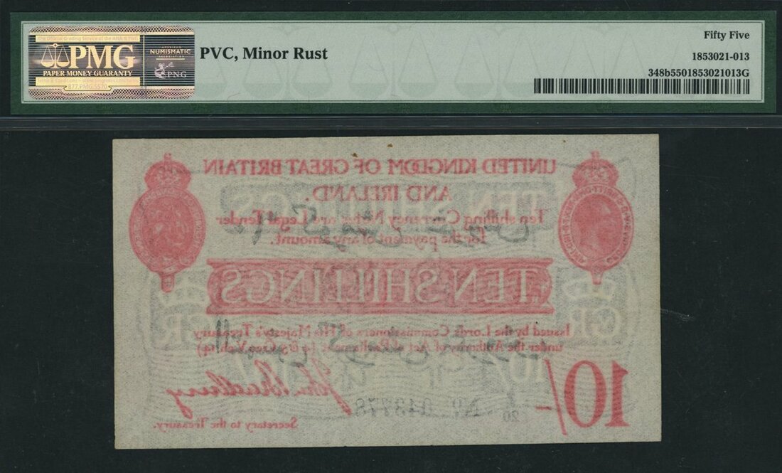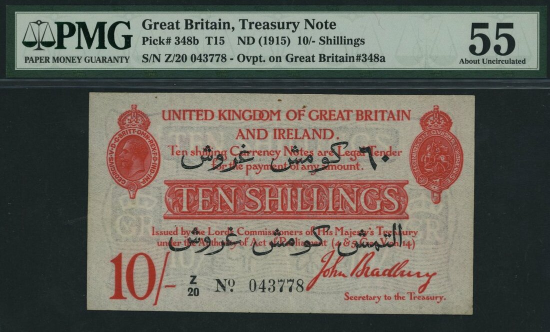 Treasury Series, John Bradbury, 10/- Shillings, ND (1915-16), Dardanelles Overprint, serial number Z/20 043778, (EPM T15), in PMG holder 55 About Uncirculated, PVC, minor rust, scarce in this grade