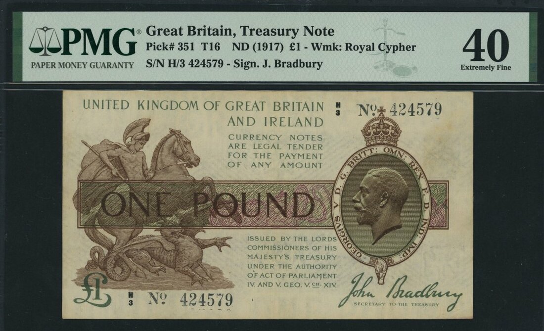 Treasury Series, John Bradbury, £1, ND (1917), last series serial number H/3 424579, (EPM T16), in PMG holder 40 Extremely Fine, annotations, Ex Mark T. Ray Collection